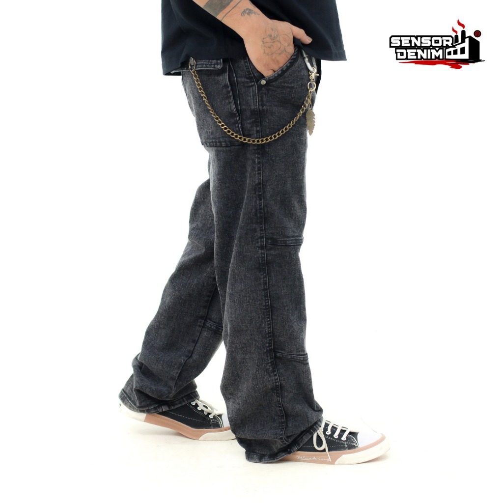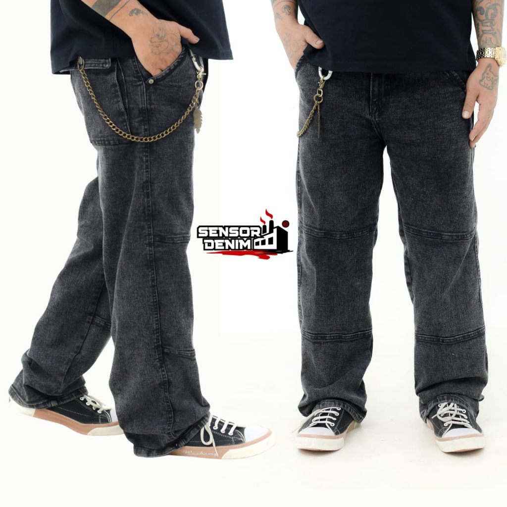 Sensorline - Celana Jeans Wide Leg Skena Gombrong Black Wash Pria - Loose Fit Bahan Denim Stretch