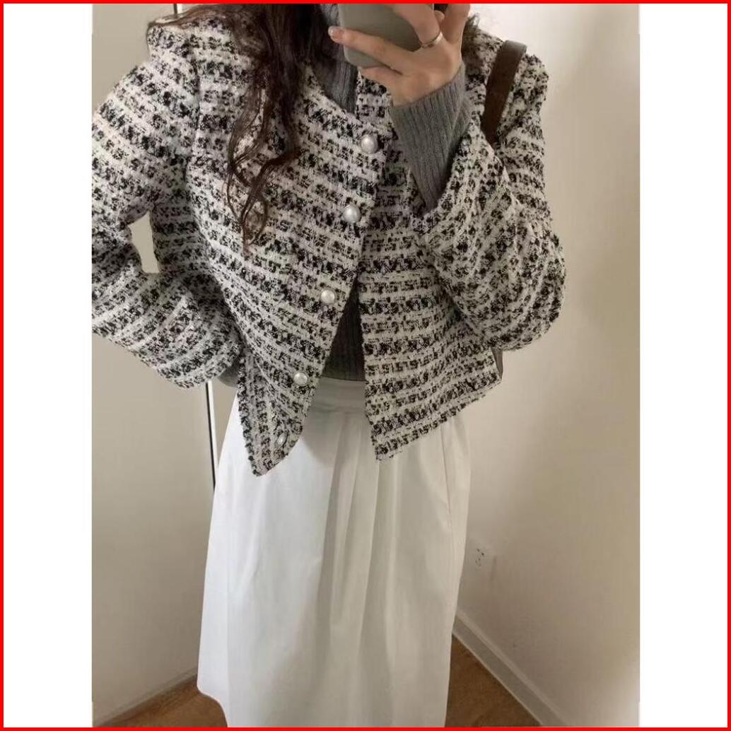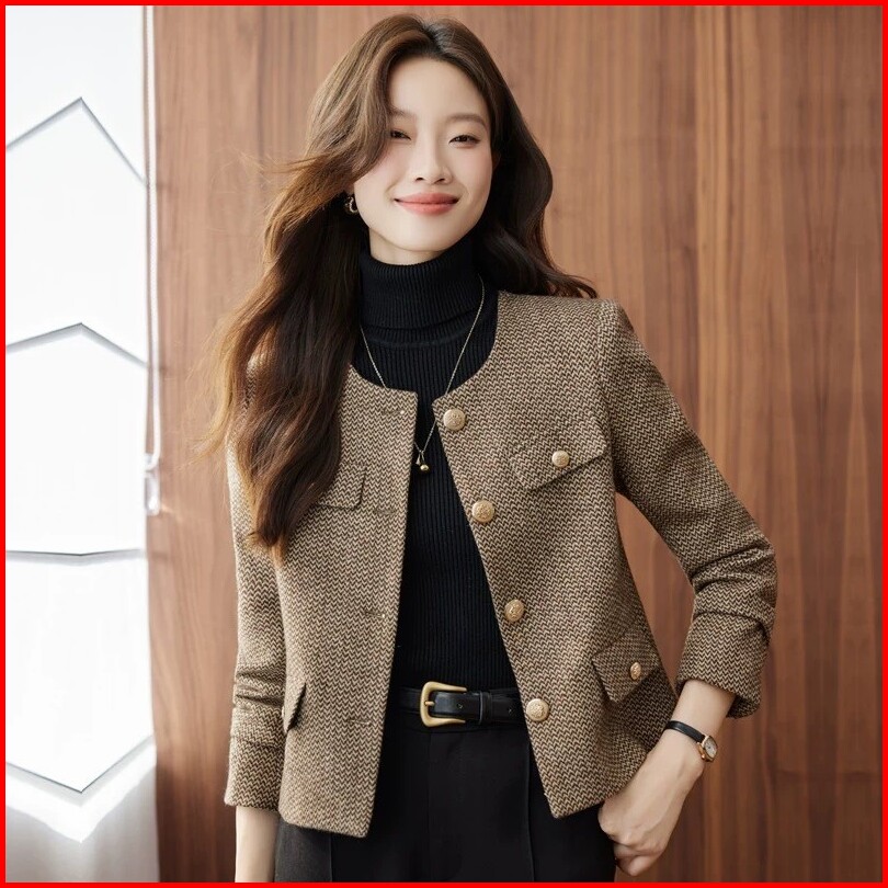Emita Bloom Baju Outer Coklat Crop Top Lengan Panjang Blazer Wanita Kekinian Premium Korean Style Tweed Blazer Outer Kon
