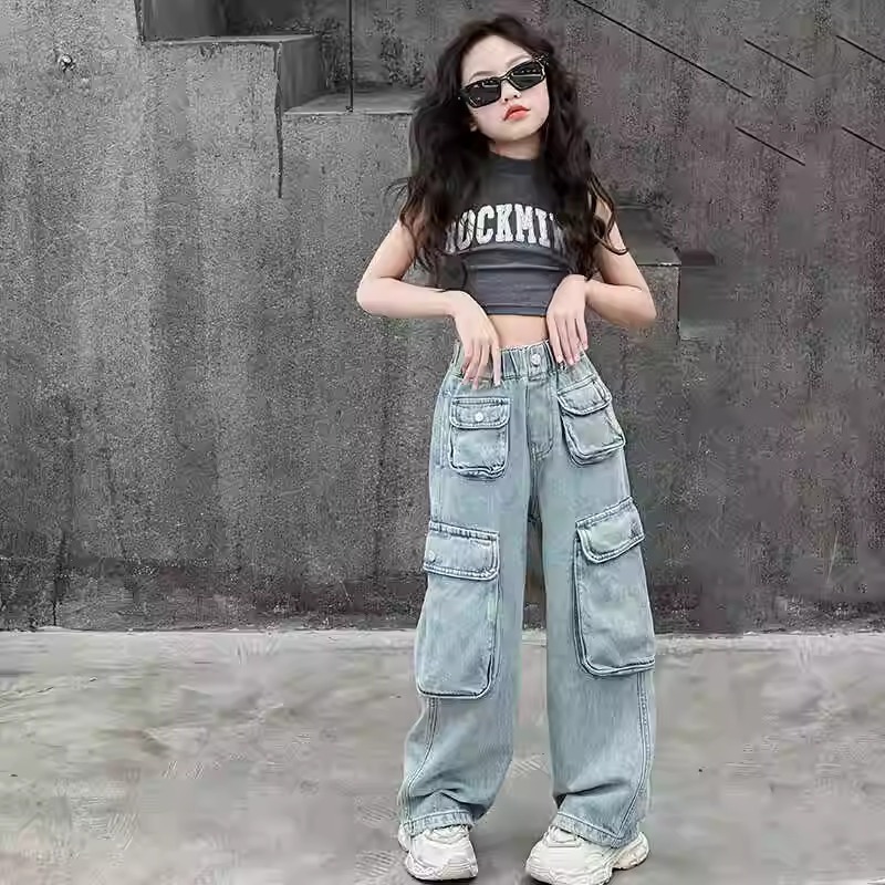 Cargo Highwaist Jeans Anak Perempuan Usia 7-12 Tahun