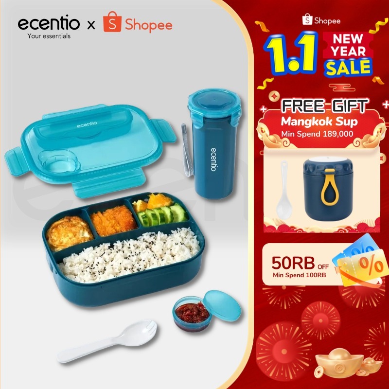 ecentio lunch box anti tumpah 1200ml & botol 500ml tempat makan tempat bekal makan tempat makan anak sekolah free sendok