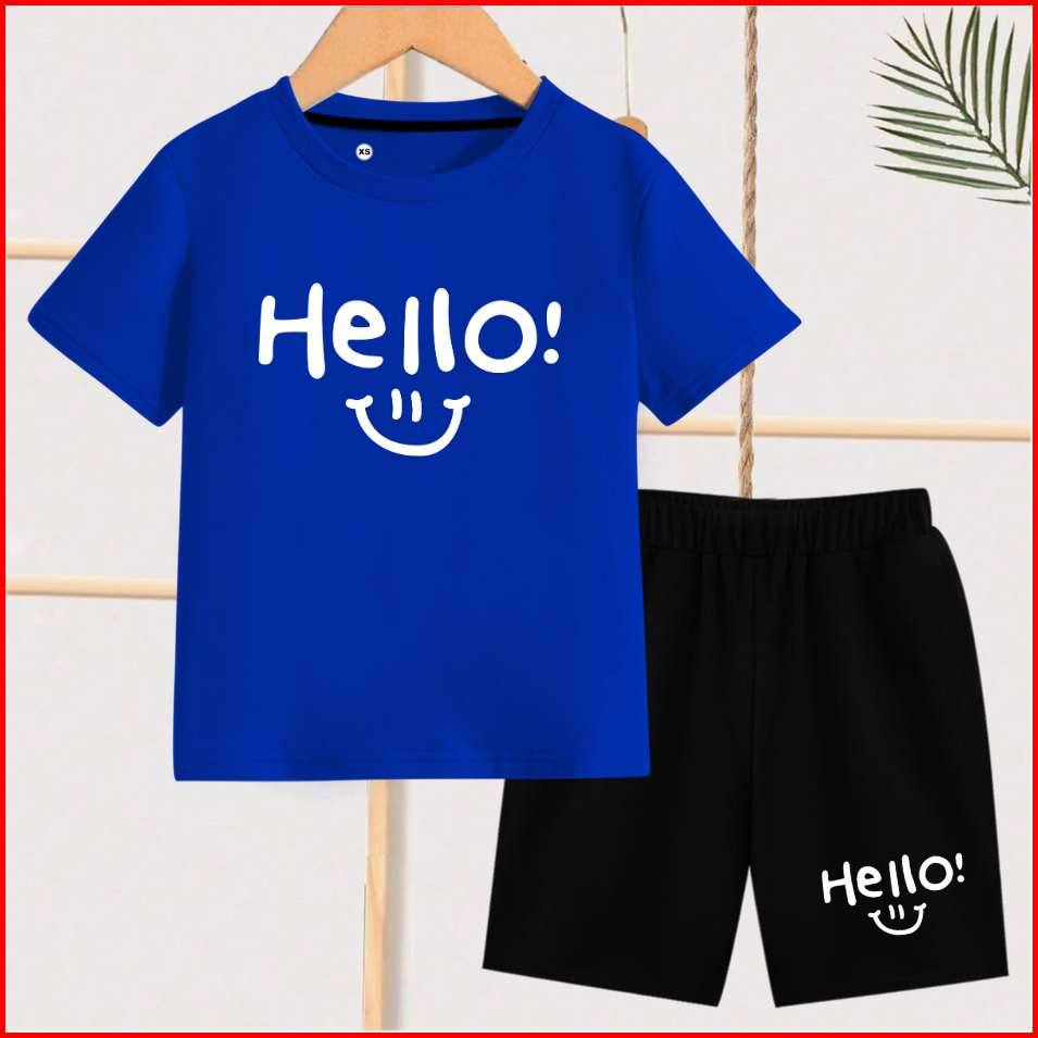 Baju Anak Setelan Hello Lengan Pendek Cowok Cewek Bahan Katun Umur 1-13 Tahun