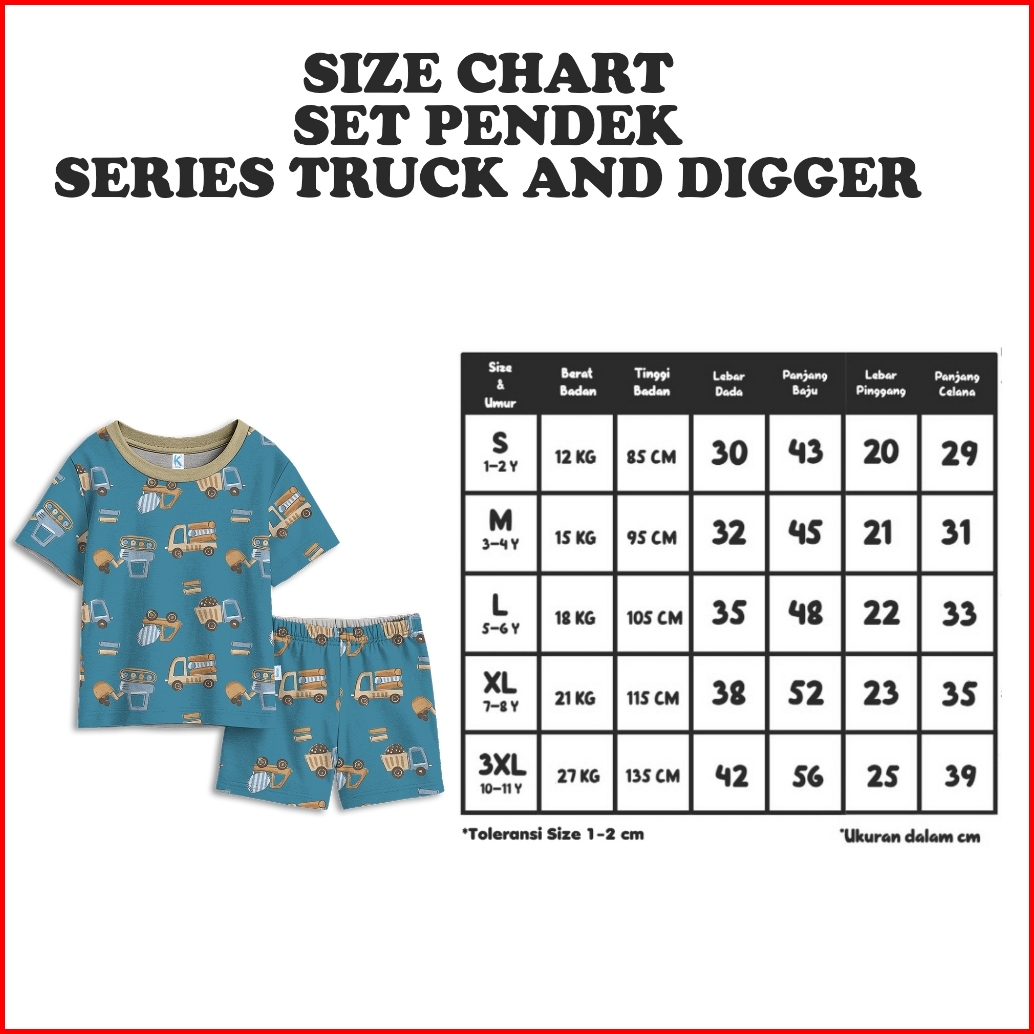 Kennai Baju Setelan Anak Pendek Laki Laki Oneset Anak Perempuan Series Truck And Digger Usia 1-12 Tahun