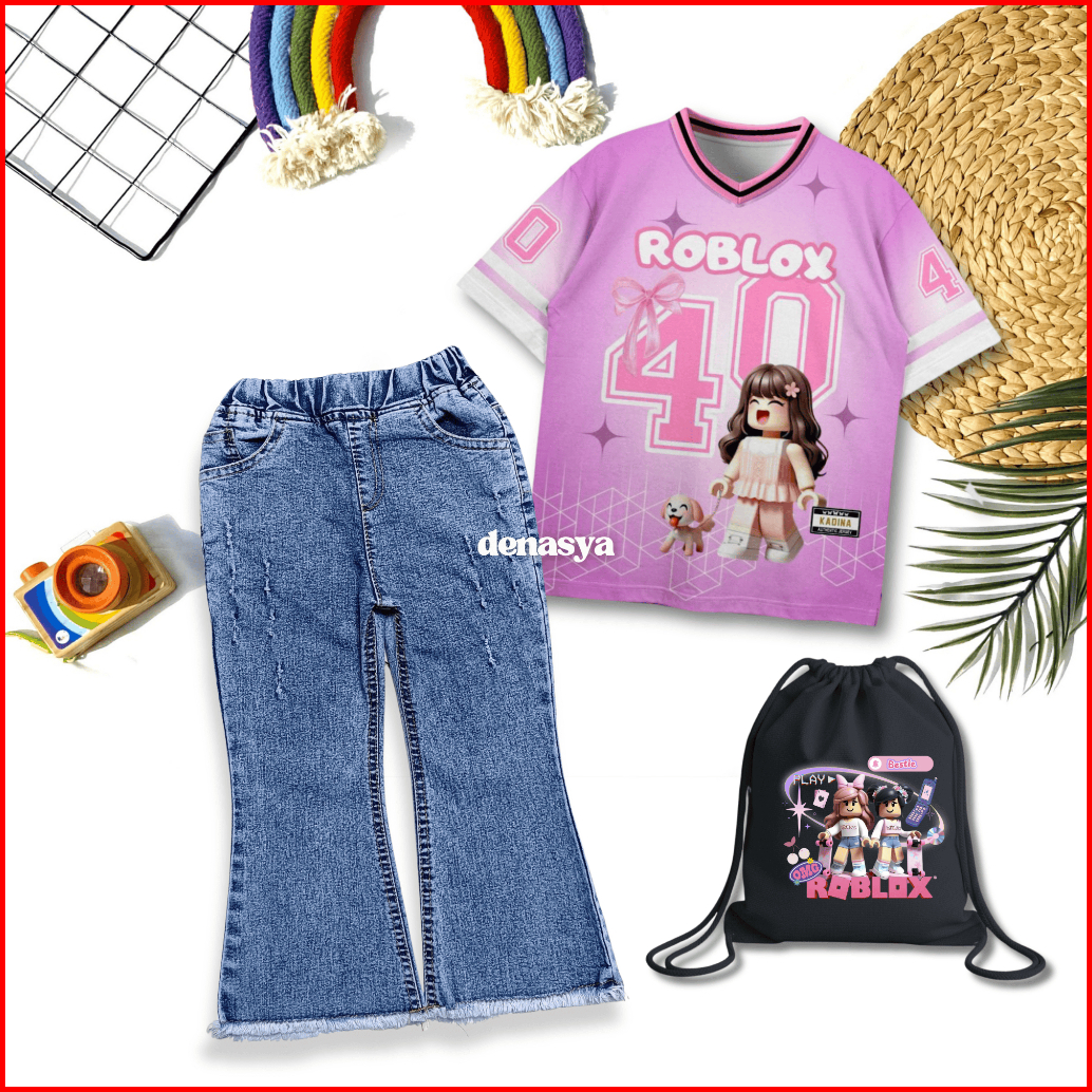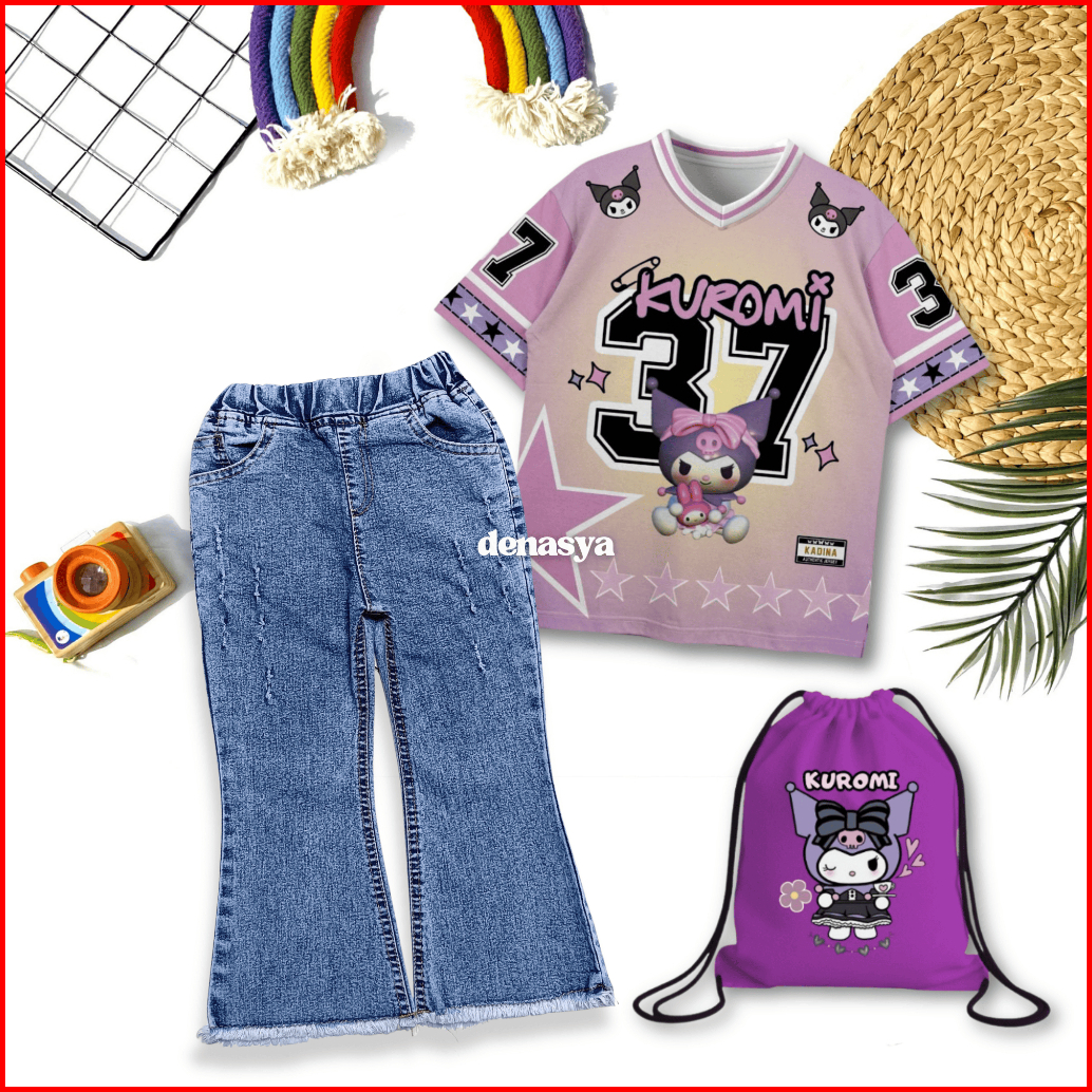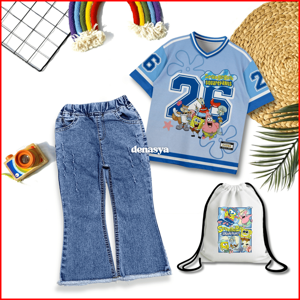 Free Tas Serut Setelan Anak Perempuan Kaos Jersey Karakter Anak Terbaru Celana Cutbray Jeans Rawis One Set Buy 1 Get 3 K
