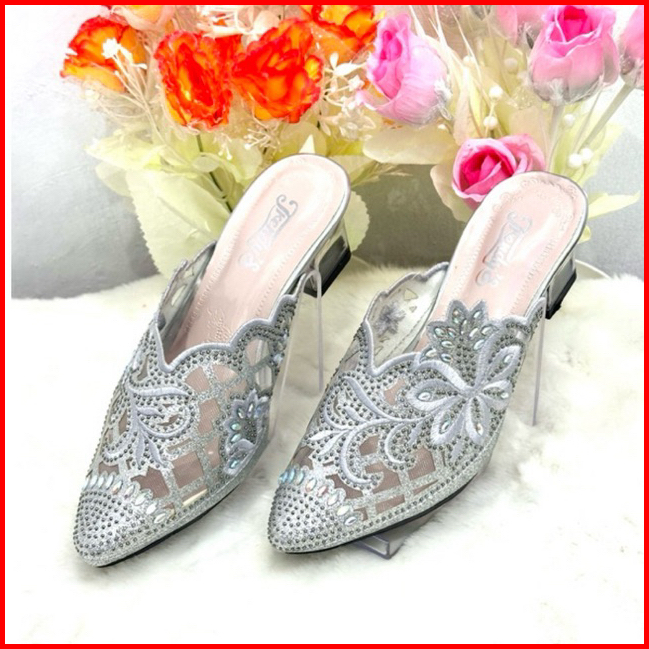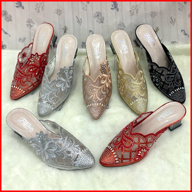 Sandal Hells Hak Kaca Fu-02 Size 36-42 Hak Kaca 5 Cm Untuk Pesta Kondangan Pernikahan Wanita - Gliter Premium Berkualita