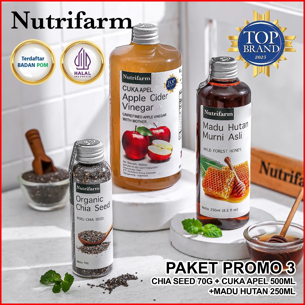 Nutrifarm Paket Promo 3 3in1 Cuka Apel Madu Hutan Chia Seed Cuka Apel 500 Ml Madu Hutan 250 Ml Chia Seed 70 Gram