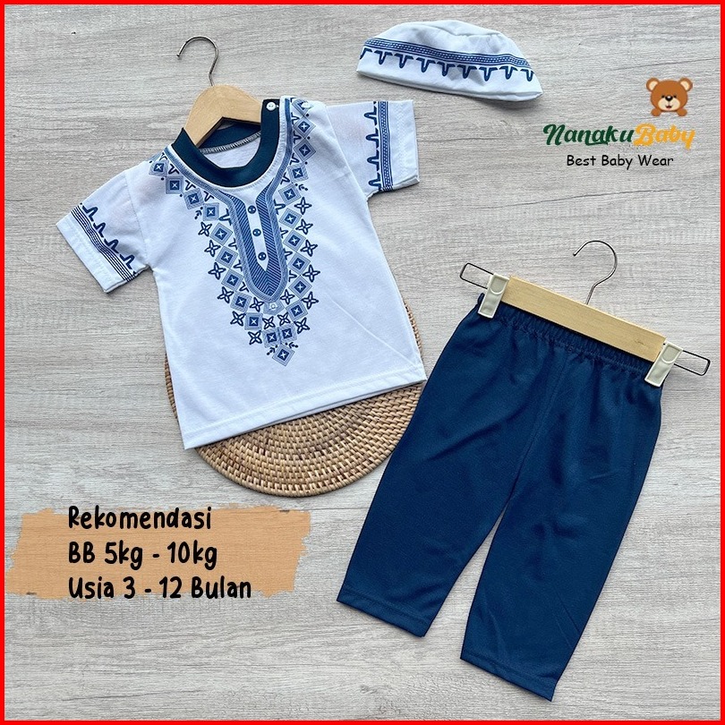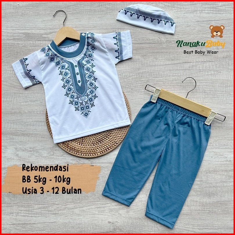 Nanaku Baby - Set Baju Koko Bayi Aqiqah Set Baju Muslim Bayi Free Peci Kancing Bahu Usia 3-12 Bulan