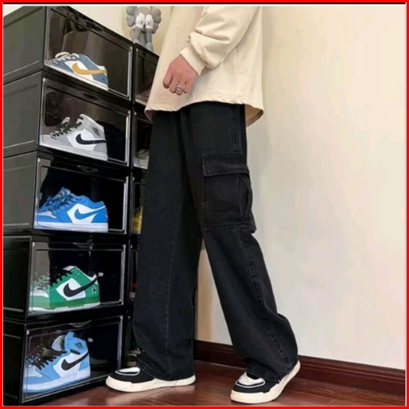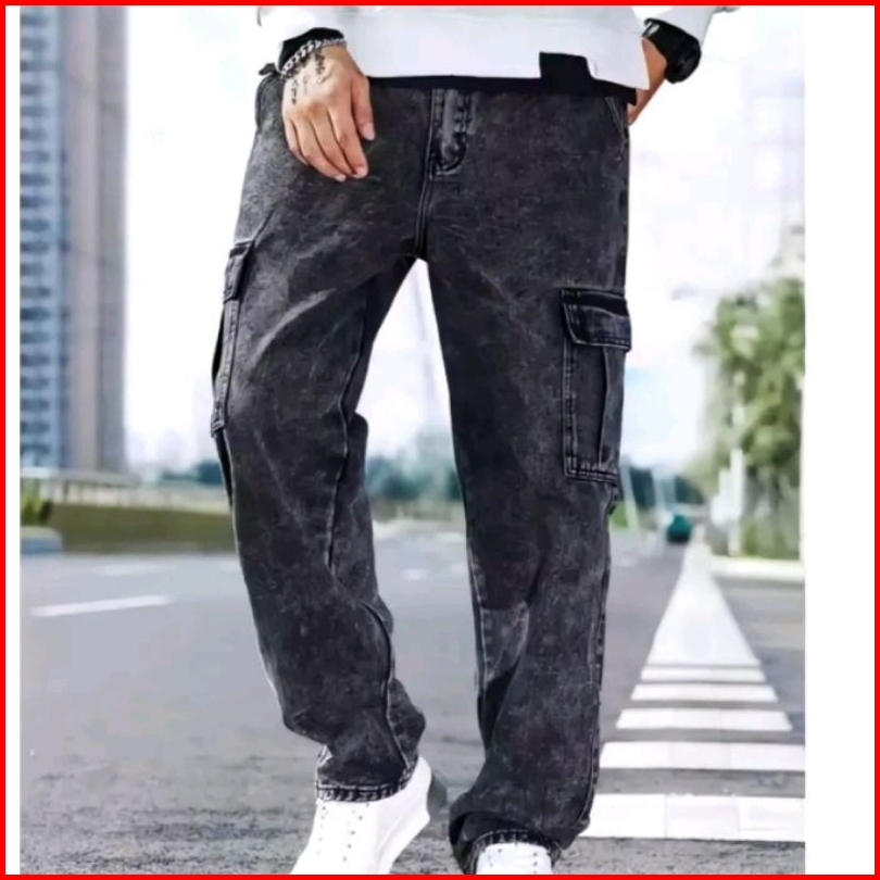 Celana Cargo Jeans Panjang Pria Loose Fitt Gombrong Oversize Korean Style Kulot Baggy Pants