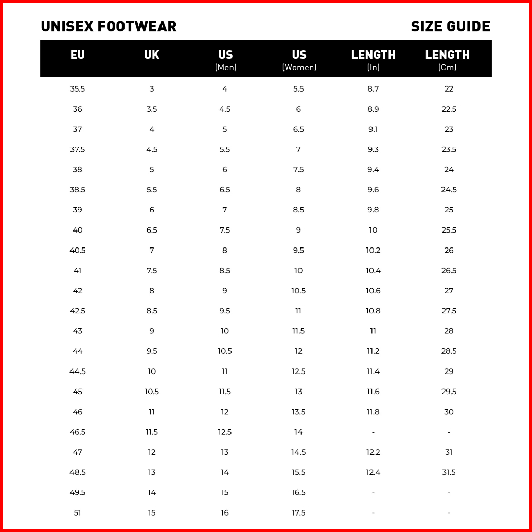 EU: 35,5, EU: 36, EU: 37, EU: 37,5, EU: 38, EU: 38,5, EU: 39, EU: 40, EU: 40,5, EU: 41, EU: 42, EU: 42,5, EU: 43, EU: 44, EU: 44,5, EU: 45, EU: 46, EU: 47, EU: 48,5
