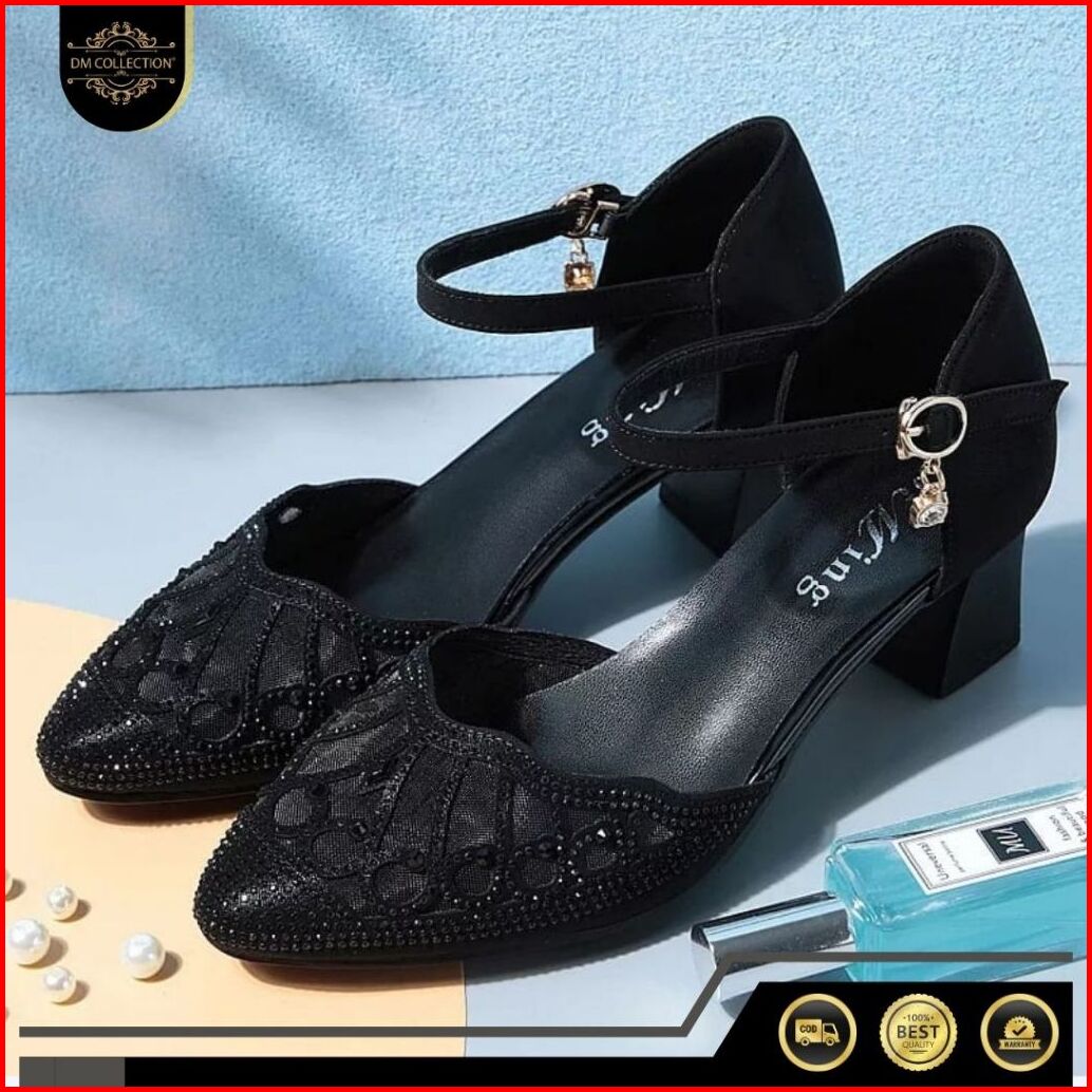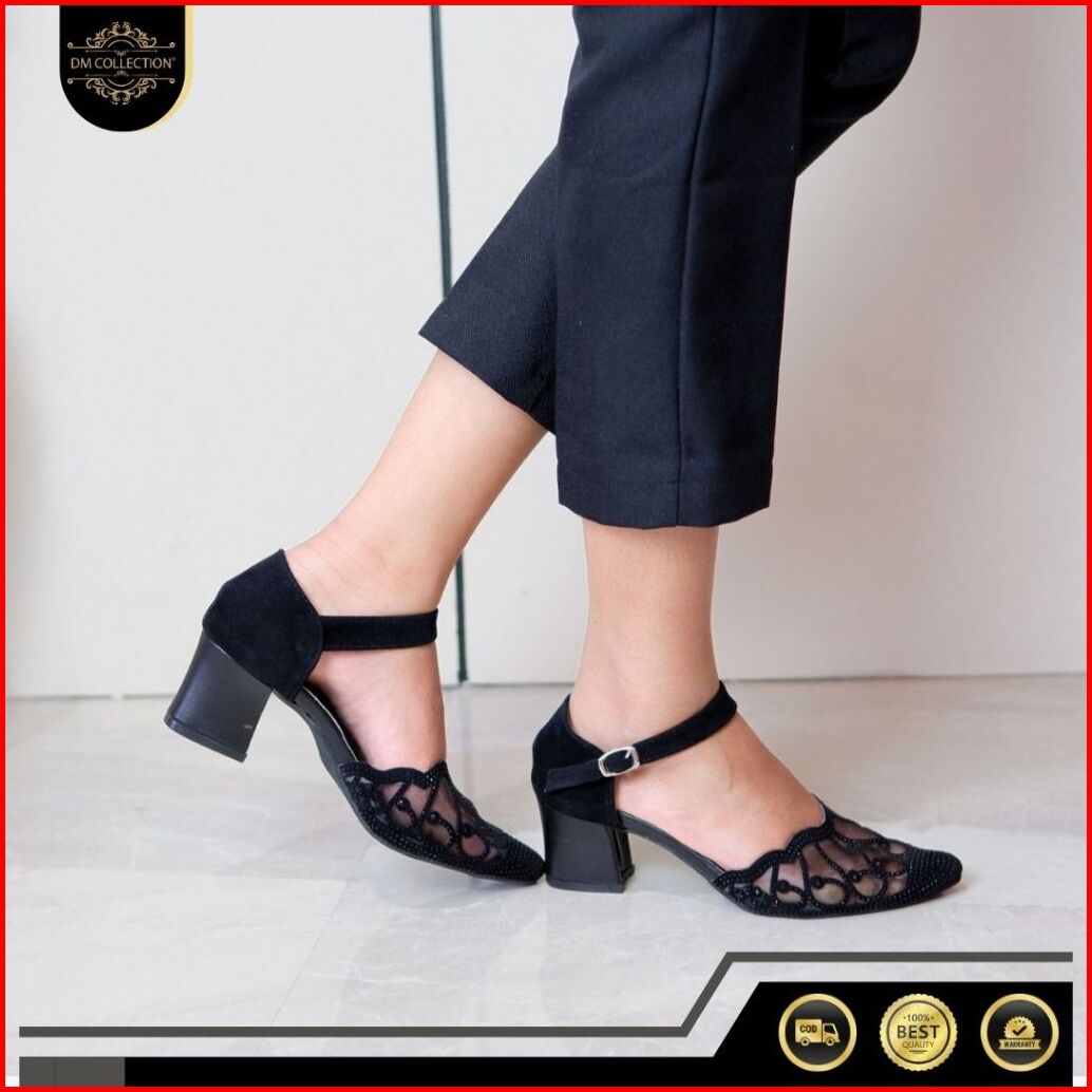 Dm Shopp - Sandal Heels Pesta Pernikahan Natal Bahan Gliters Kombinasi Mote Jala Ujung Lancip Suede Lembut Spt 017