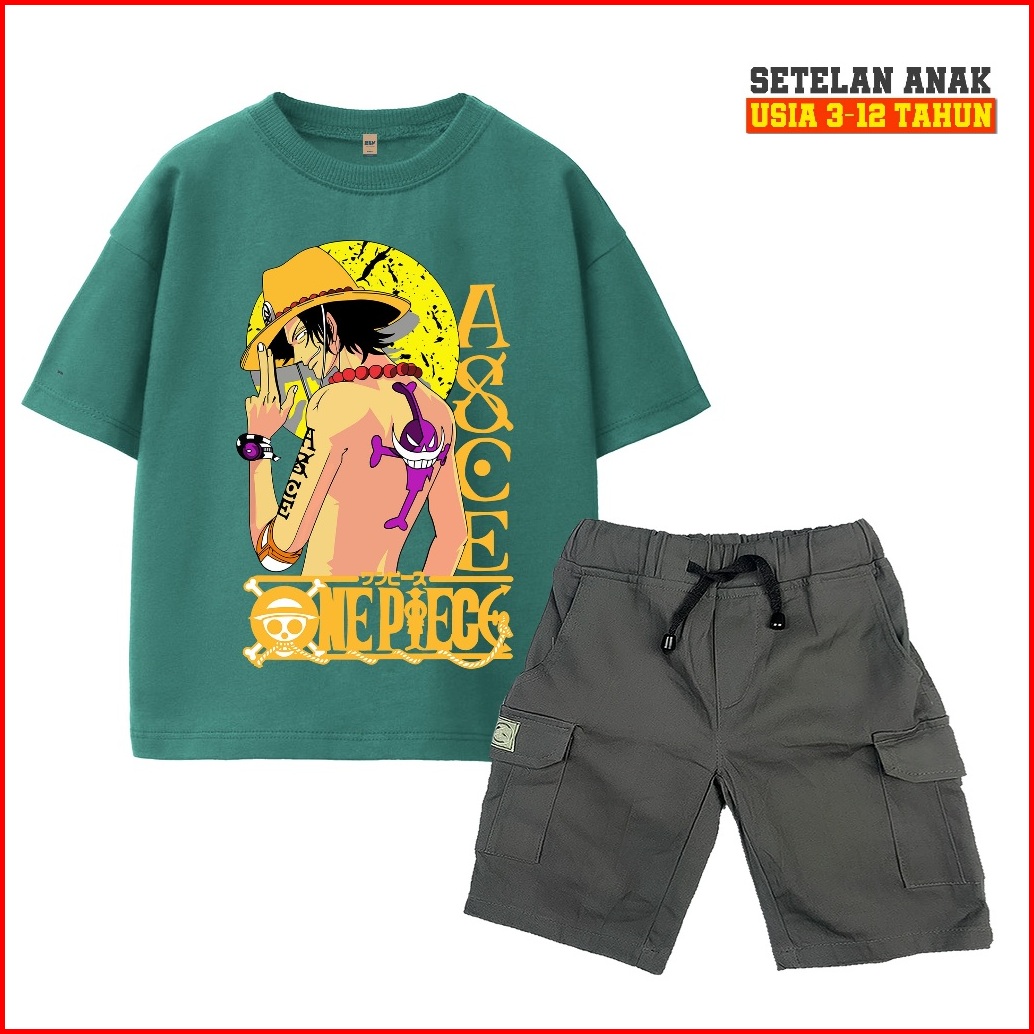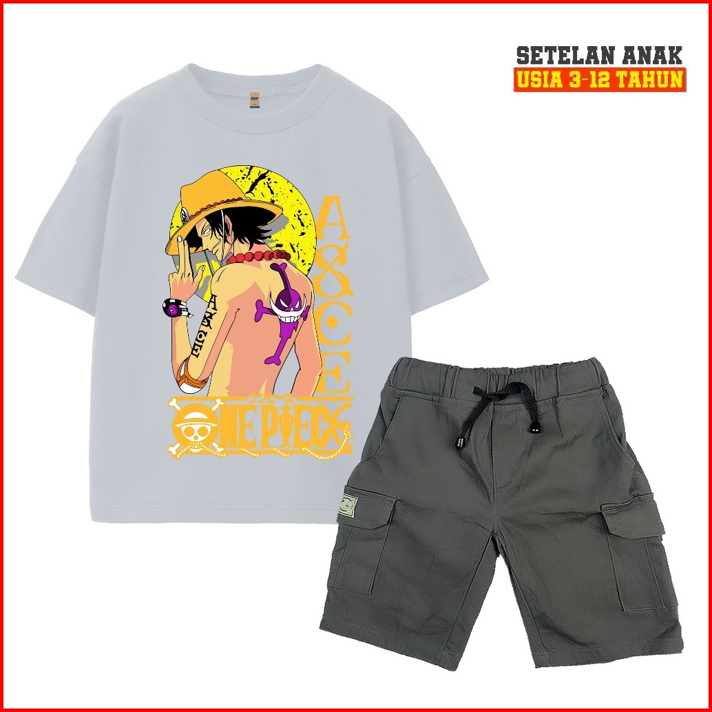 Setelan Anak Terbaru One Piece Ace Kaos Katun Dtf Premium Celana Cargo Pendek Premium 3-12 Tahun