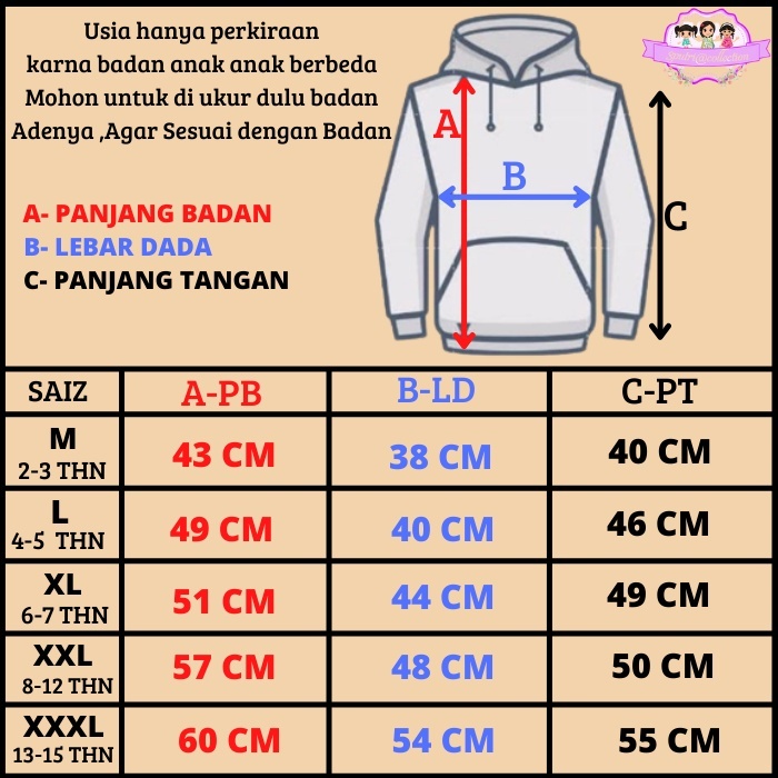 M (2-4 thn), L (4-6 thn), XL (6-7 thn), XXL (8-10 thn), XXXL (11-13 thn)