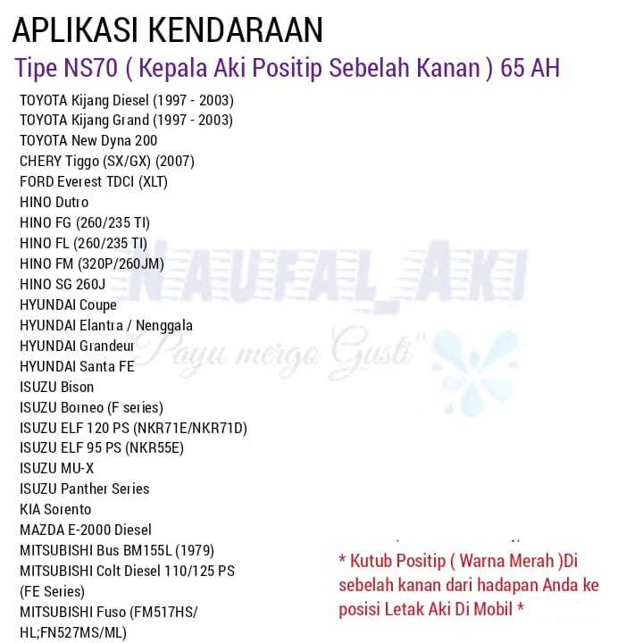 Aki Mobil Kijang Diesel /Grand/Isuzu ELP/Bison/Hino dutro FL FG FM SG /Ford Everest/Colt Diesel GS N50 50 AH