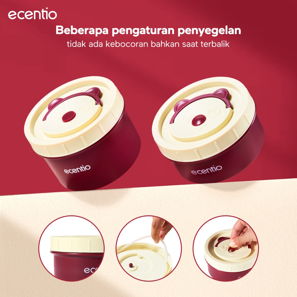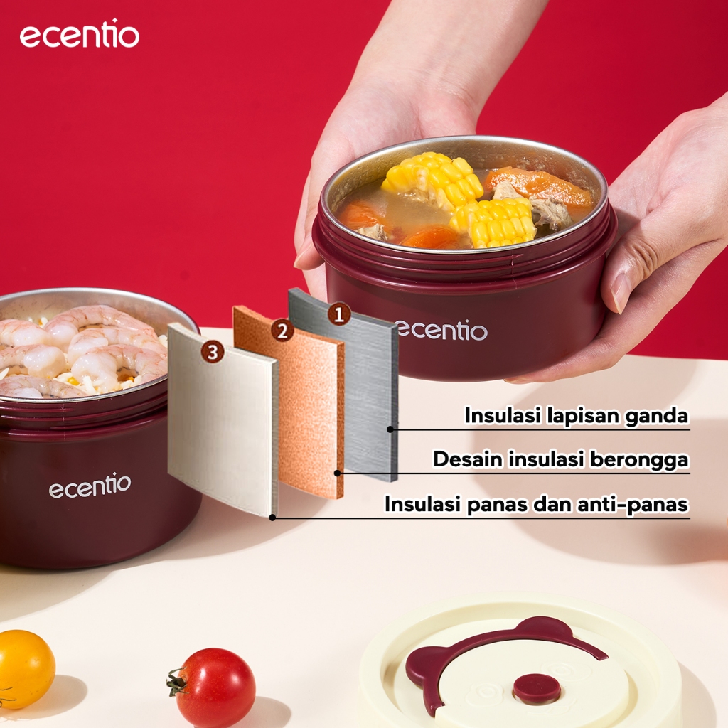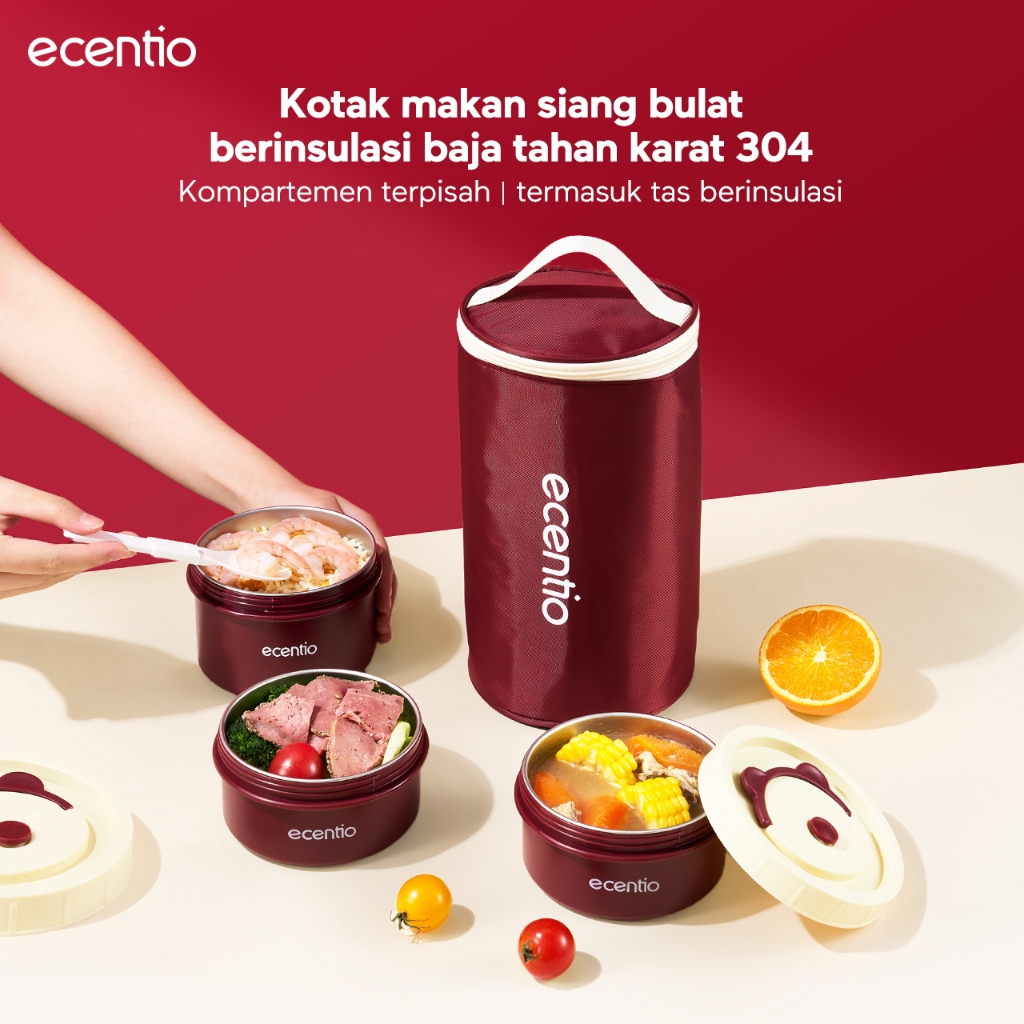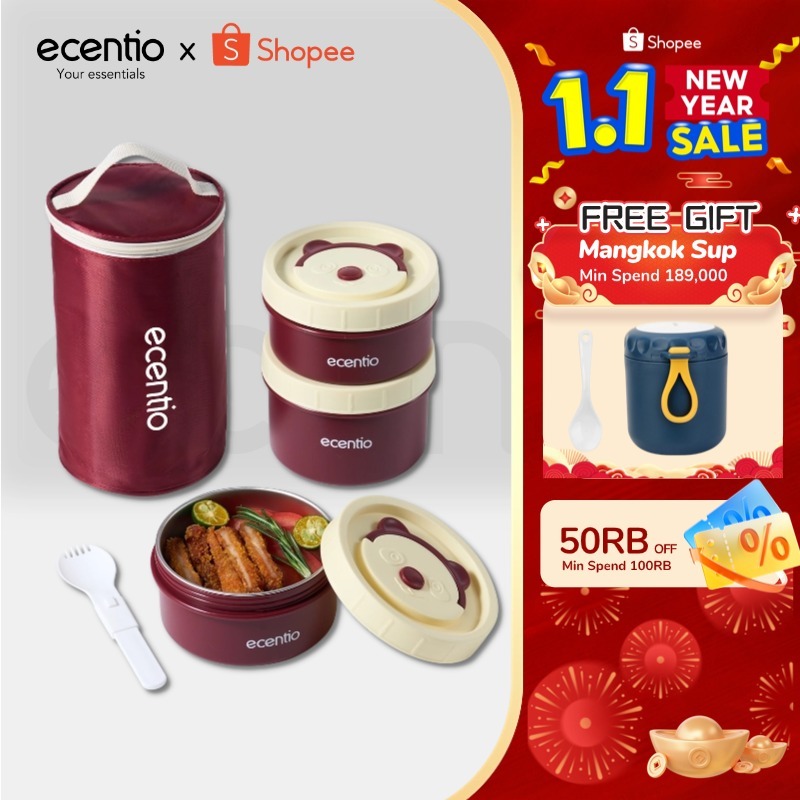 ecentio lunch box tas set 3pcs merah Kotak Makan anti tumpah 304 Stainless Steel tas bekal dan free sendok Murah Gratis