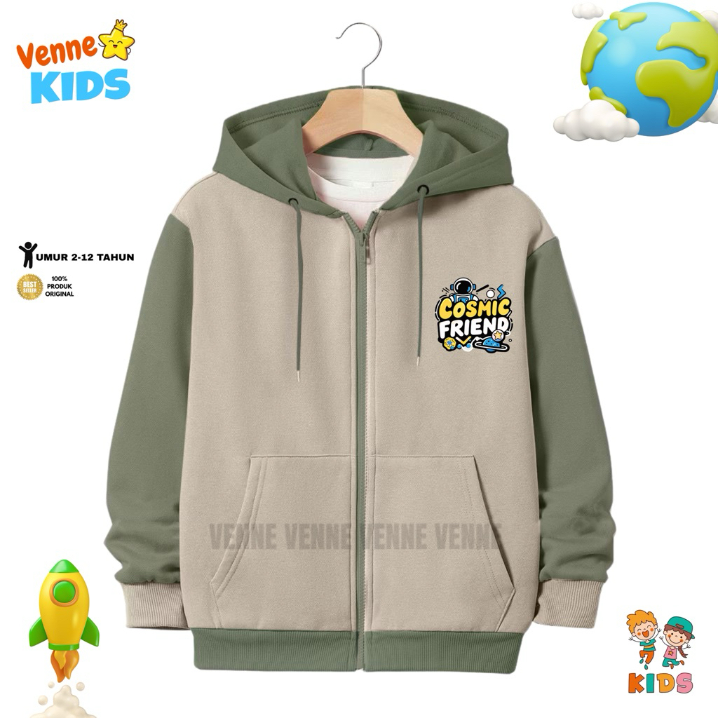 Pakaian Anak Keren Jaket Zipper Anak Laki-Laki Perempuan Usia 2-12Tahun Kombinasi Polos Sablon Cosmic Friends Bahan Fleece Premium By Venne Kids
