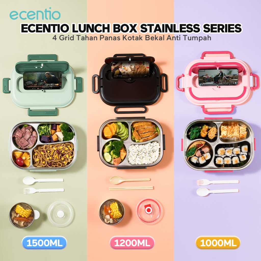 ecentio lunch box stainless 4 Grid besar Portabel kotak bekal anti tumpah Tahan Panas Kotak Makan Berisi mangkuk sup den