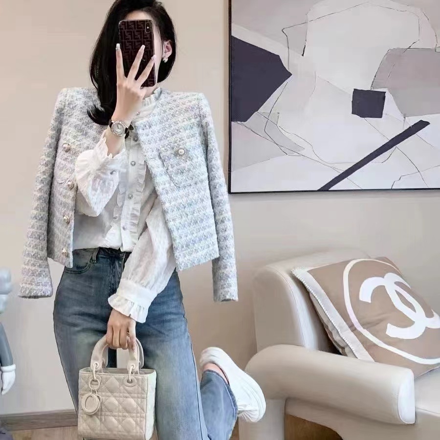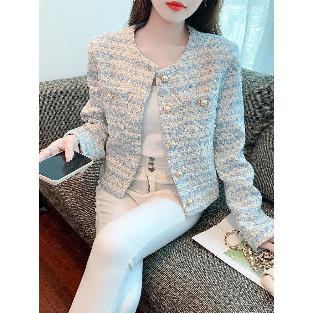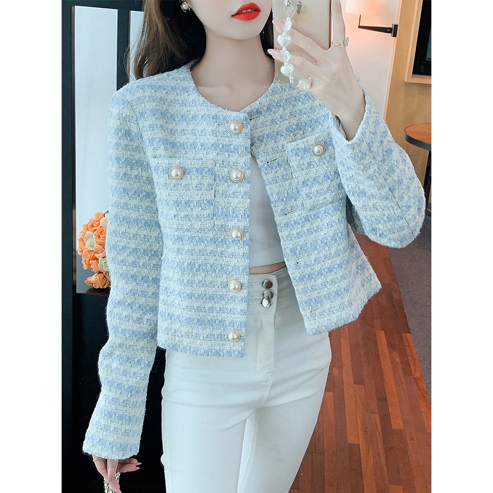 Blazer Biru Tweed Blazer Wanita Crop Top Korean Style M601