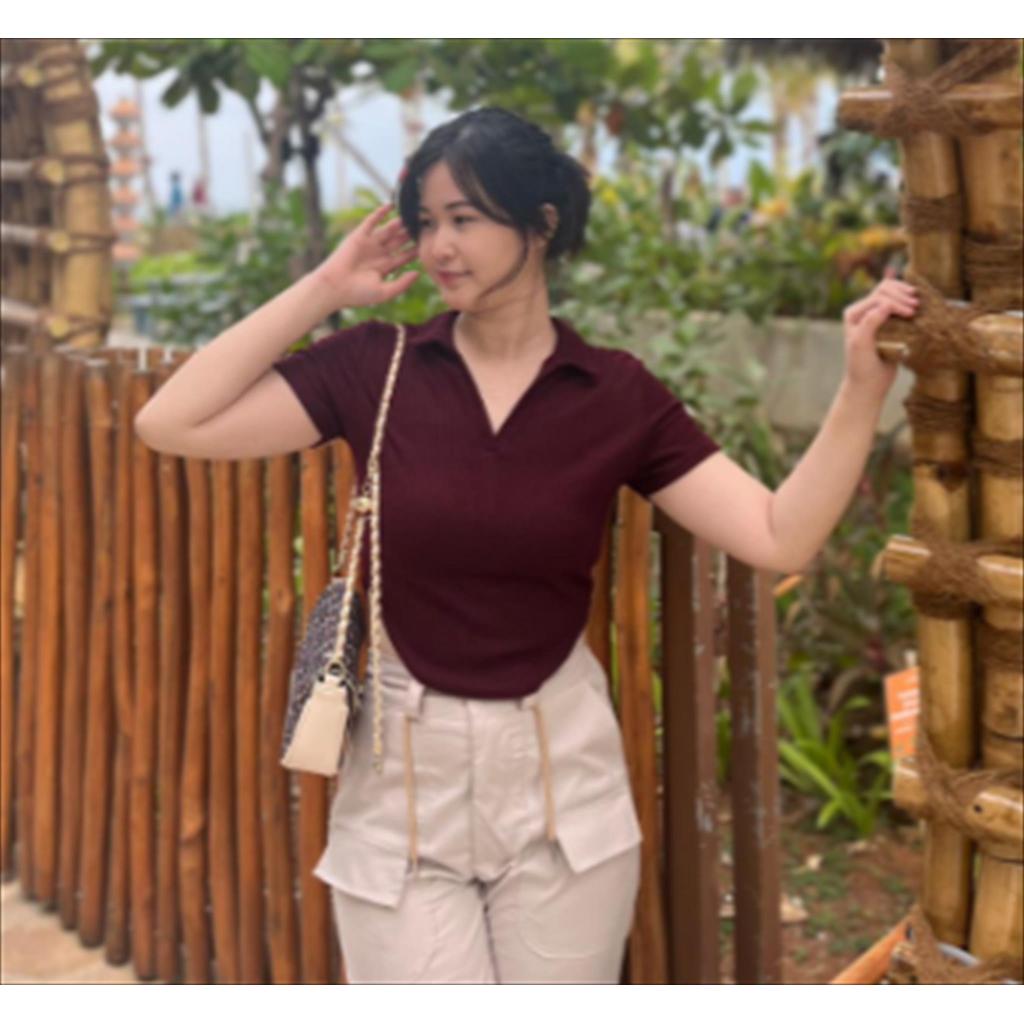 Elda label crop top v neck oval kekinian lengan pendek wanita Murah Gratis Ongkir