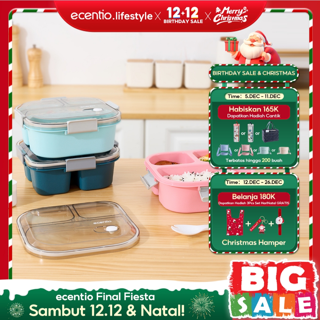ecentio Kotak Makan 3 Grid 1100ml+100ml lunch box tempat sendok wadah bekal anti tumpah anak fit sup garpu bekal makan s