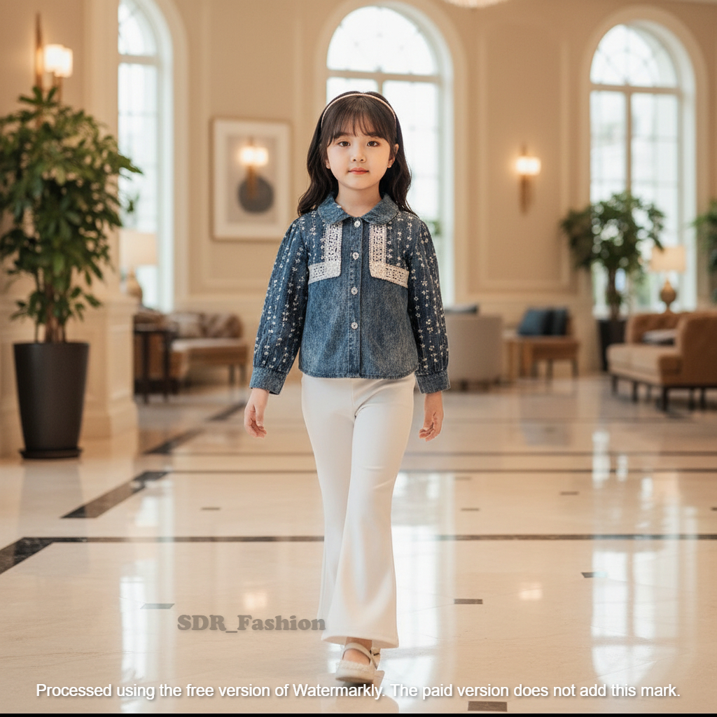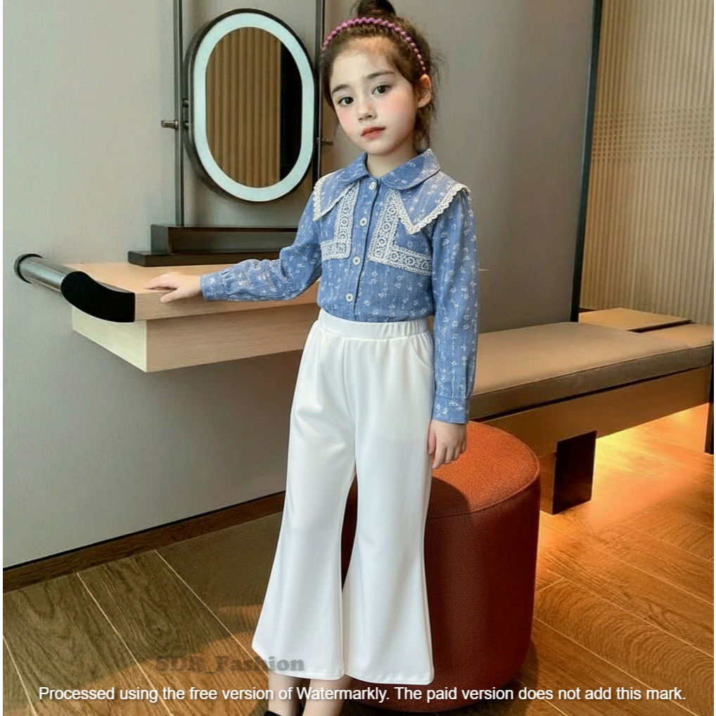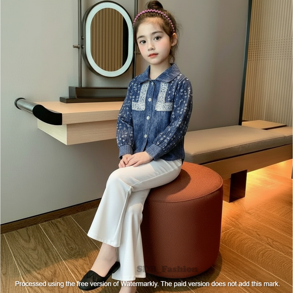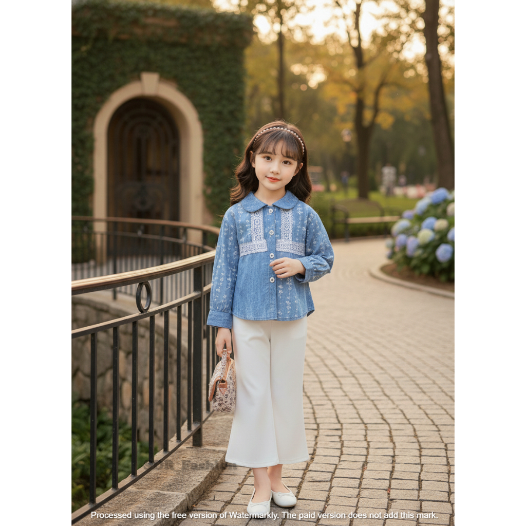 Setelan Anak Perempuan Korean Style Kemeja Motif Bunga Lengan Panjang Dengan Kerah Renda Peter Pan Yang Elegan Usia 1 Sampai 12 Tahun