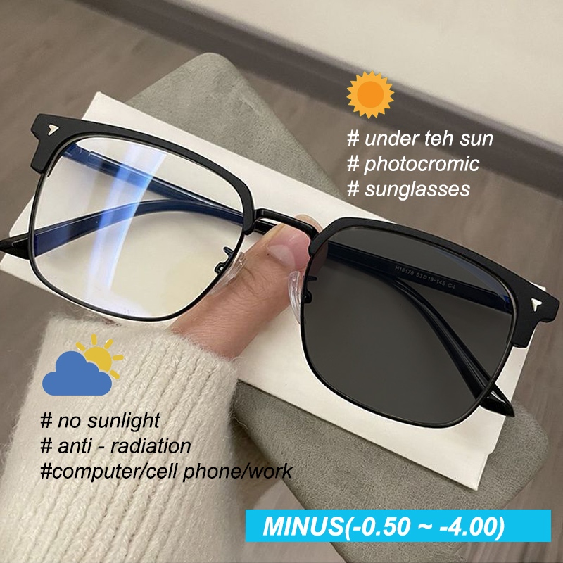 Kacamata Minus Photochromic Anti Radiasi Pria Wanita Kacamata Kotak Setengah Bingkai Bisnis Bingkai Persegi UV400