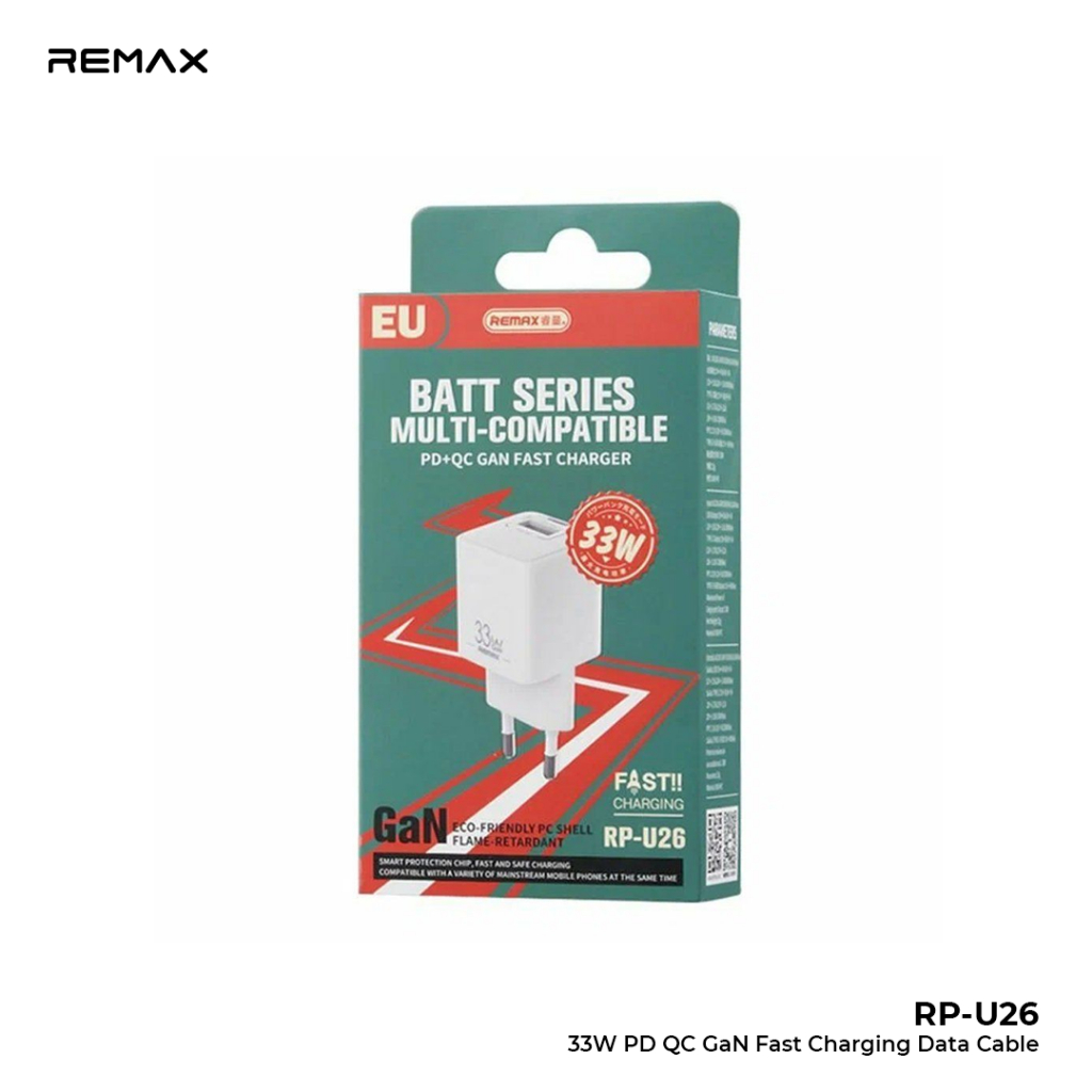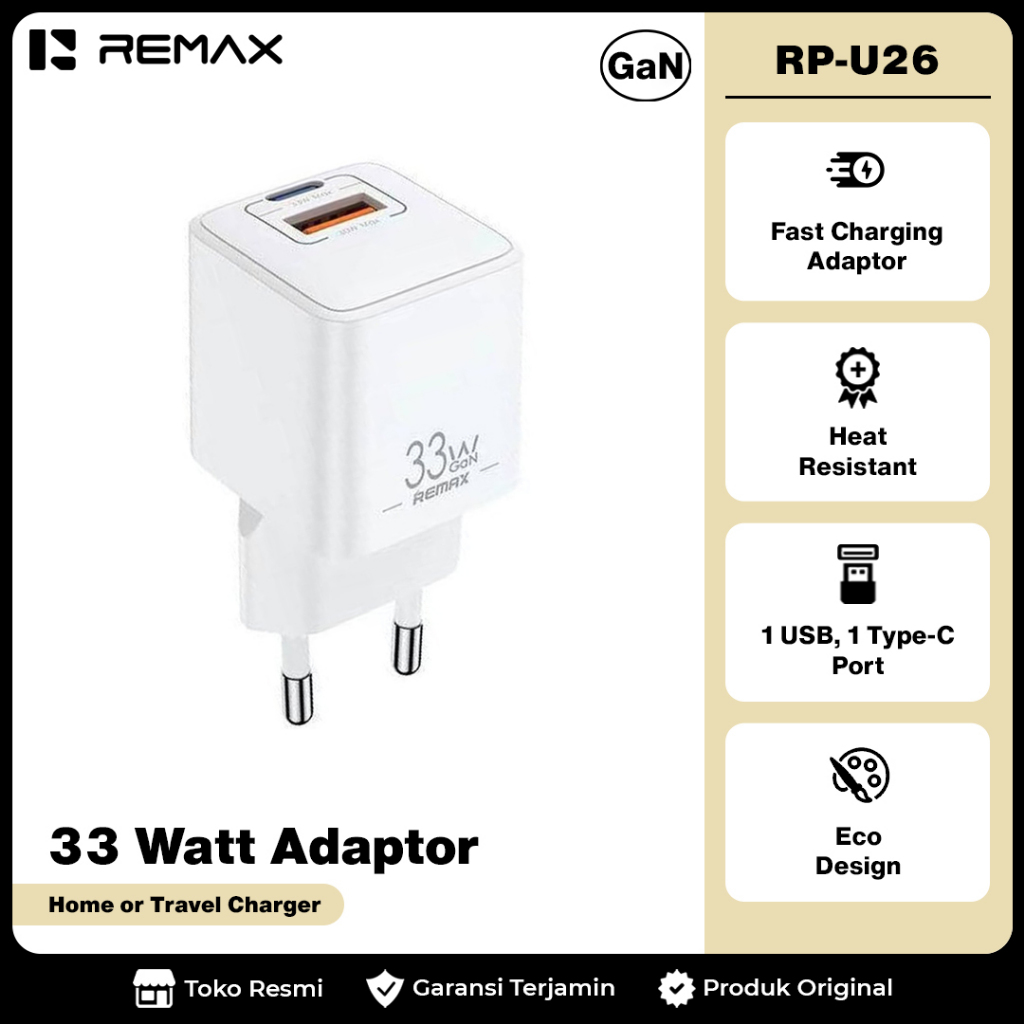 Remax GaN Kepala Charger 33W PD+QC Fast Charging Eco Friendly Smart Protection RP-U26