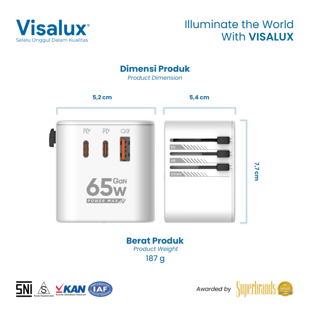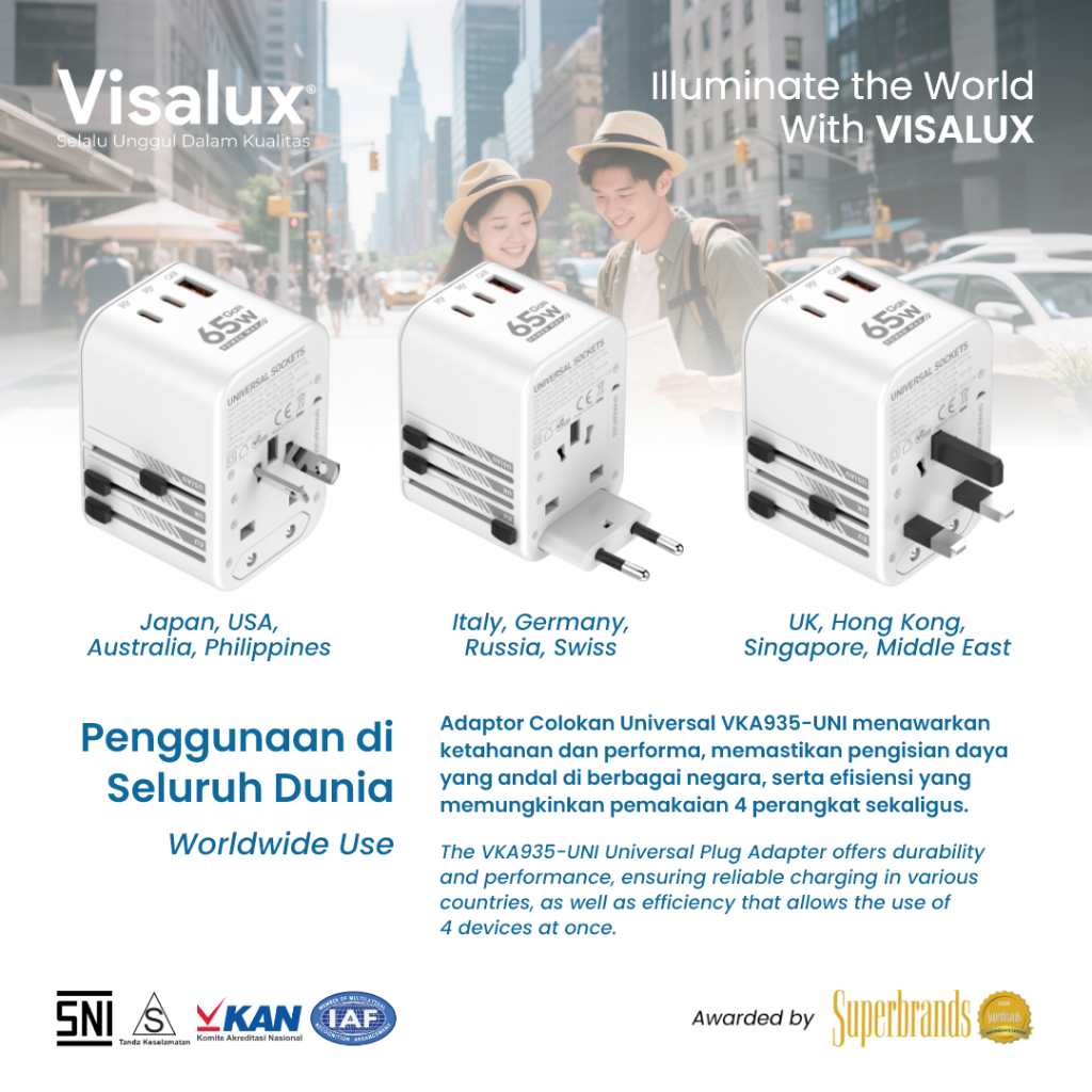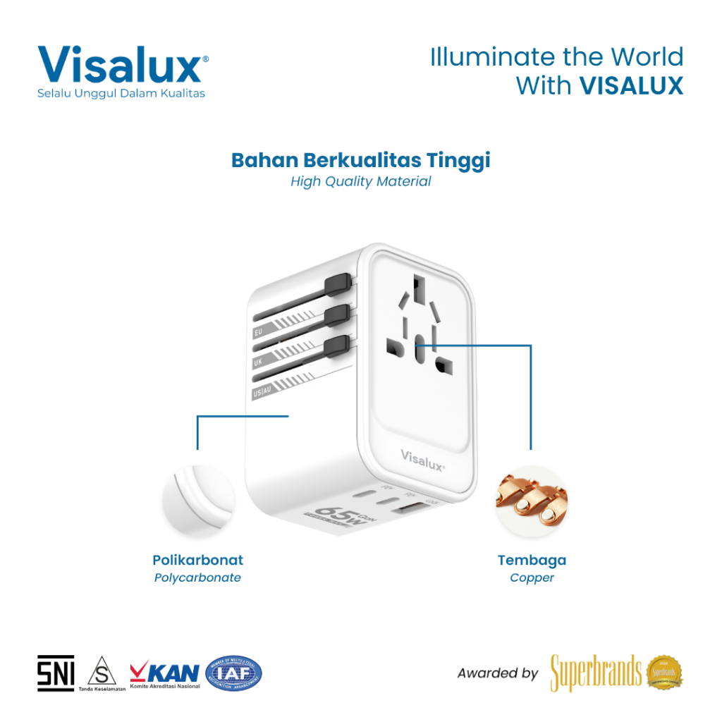 Visalux Unipro Travel Adaptor Universal Plug Type C + USB Fast Charging / Steker Serbaguna White - Colokan Internasional