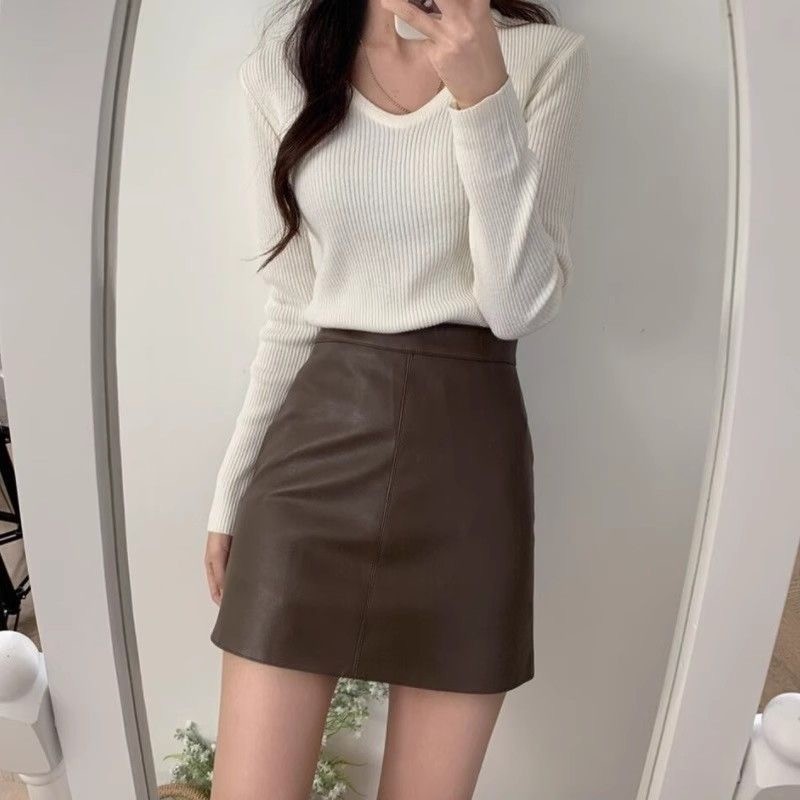 66TT Dress Darling XYJSJMY001 Rok kulit pu hitam pinggang tinggi rok pendek pinggul garis Murah Gratis Ongkir