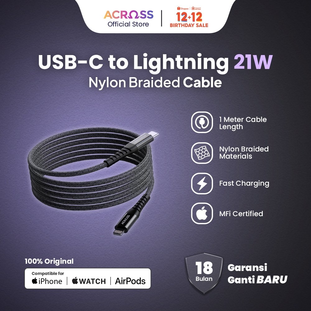 ACROSS Kabel Data Type C to Lightning 21W MFi Certified Charger for iPhone Fast Charging