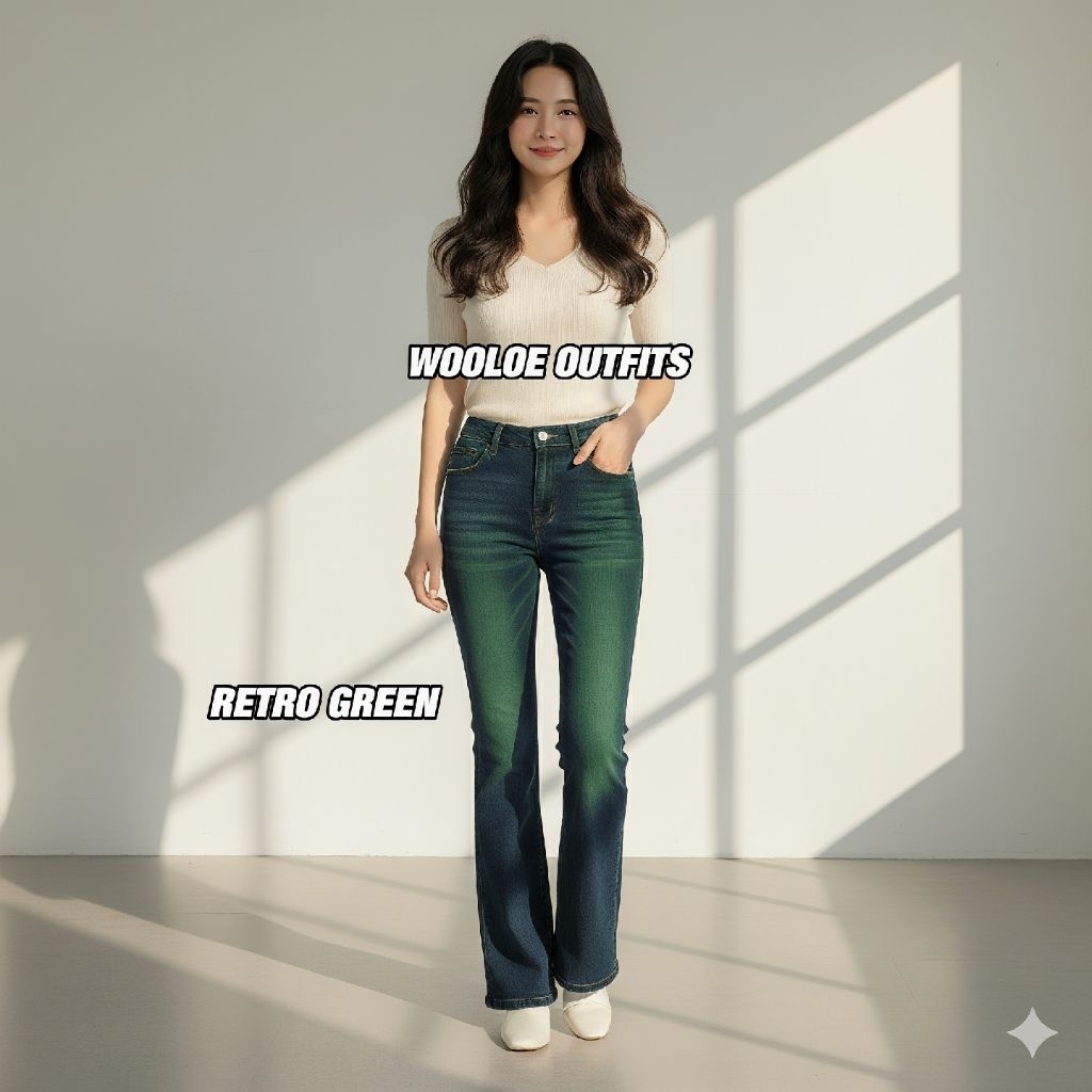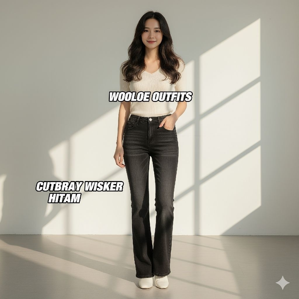 WOOLOE OUTFITS -Celana Highwaist Cutbray wisker Stretch bahan jeans 12oz bahan tidak kaku nyaman dipakai ori by wooloe o