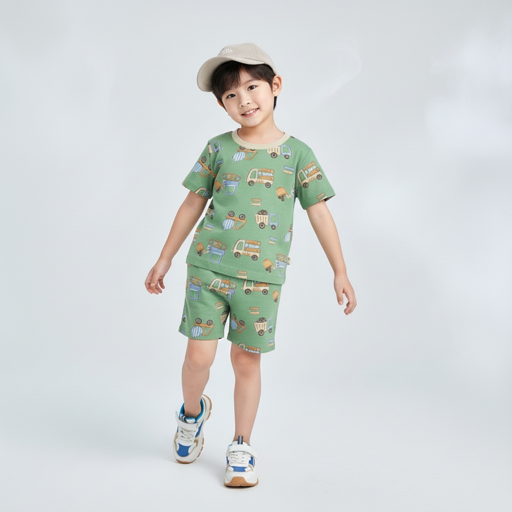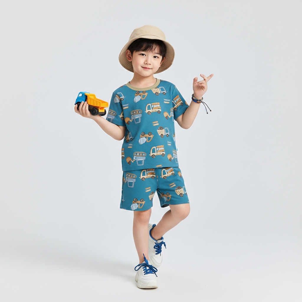 Kennai Baju Setelan Anak Pendek Laki Laki Oneset Anak Perempuan Series Truck And Digger Usia 1-12 Tahun