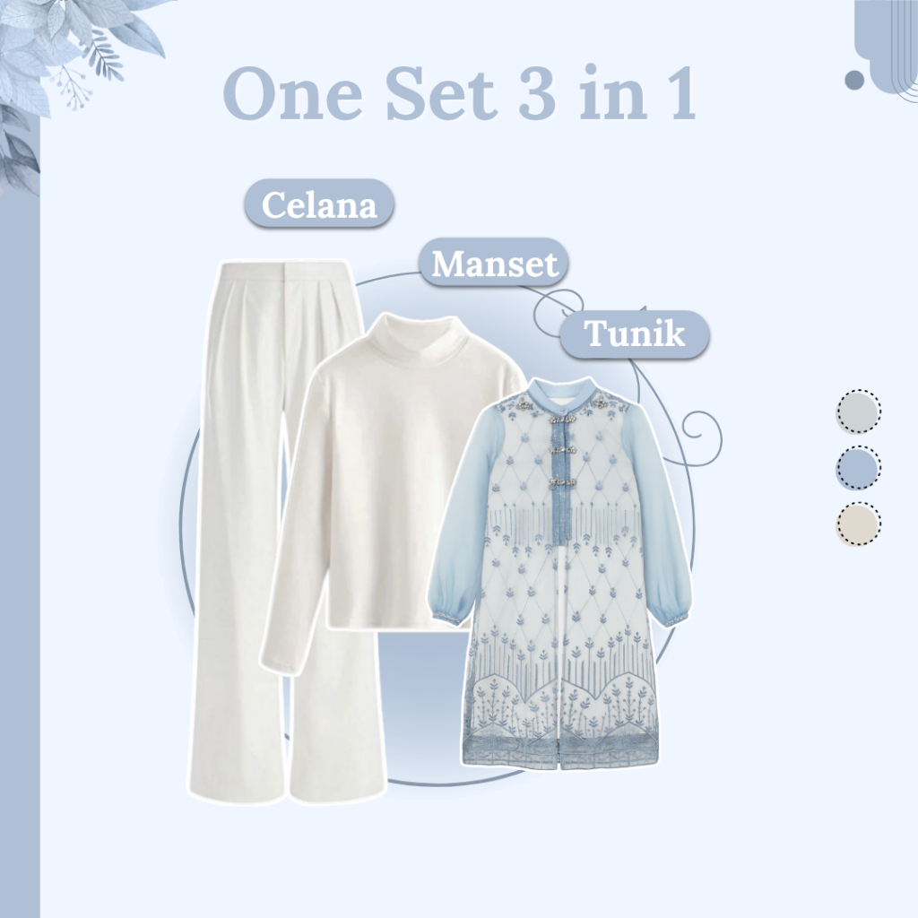 One Set Wanita Kekinian 4in1 (Tunik Brokat Blue - Manset - Celana - Jilbab) Setelan OOTD Raya RO124N