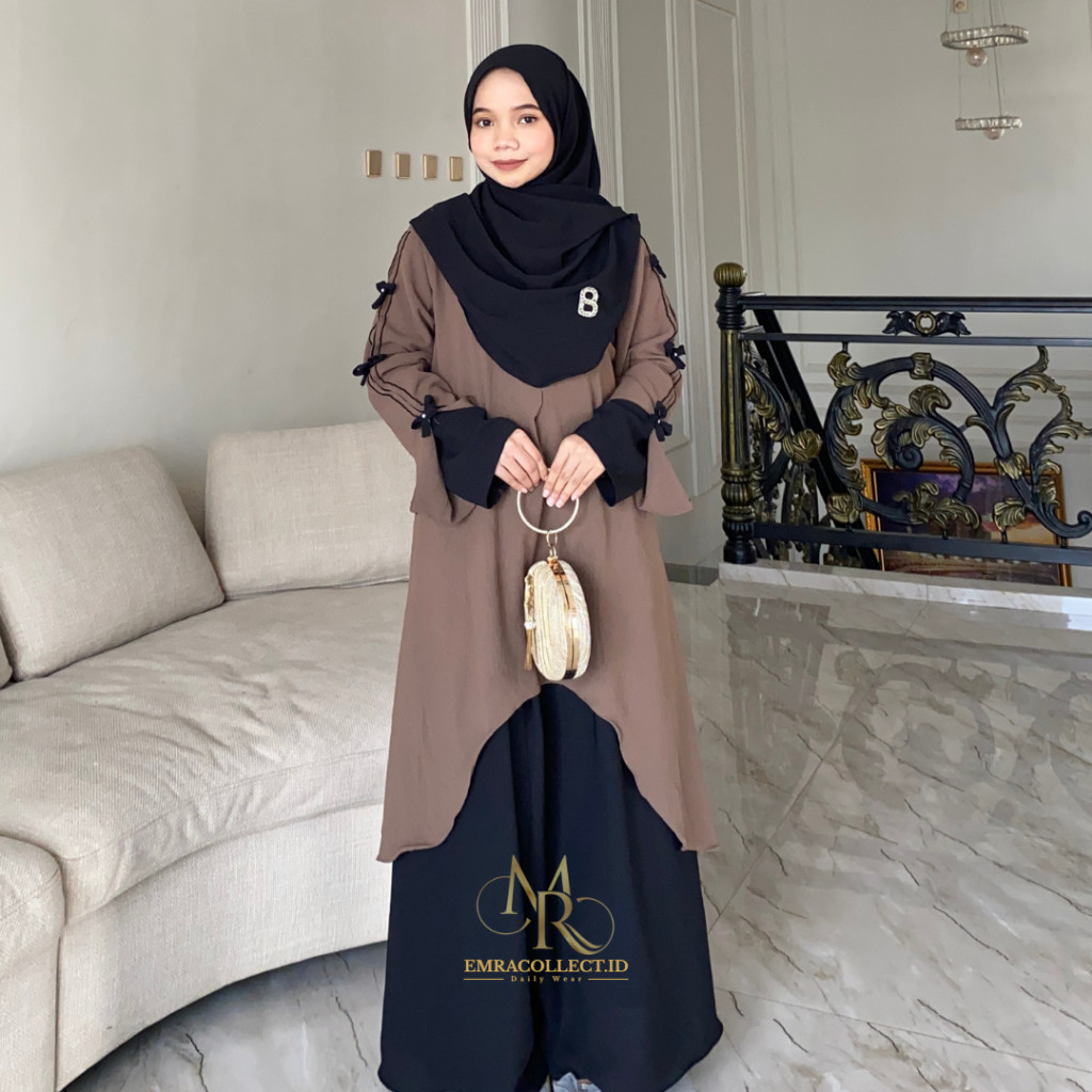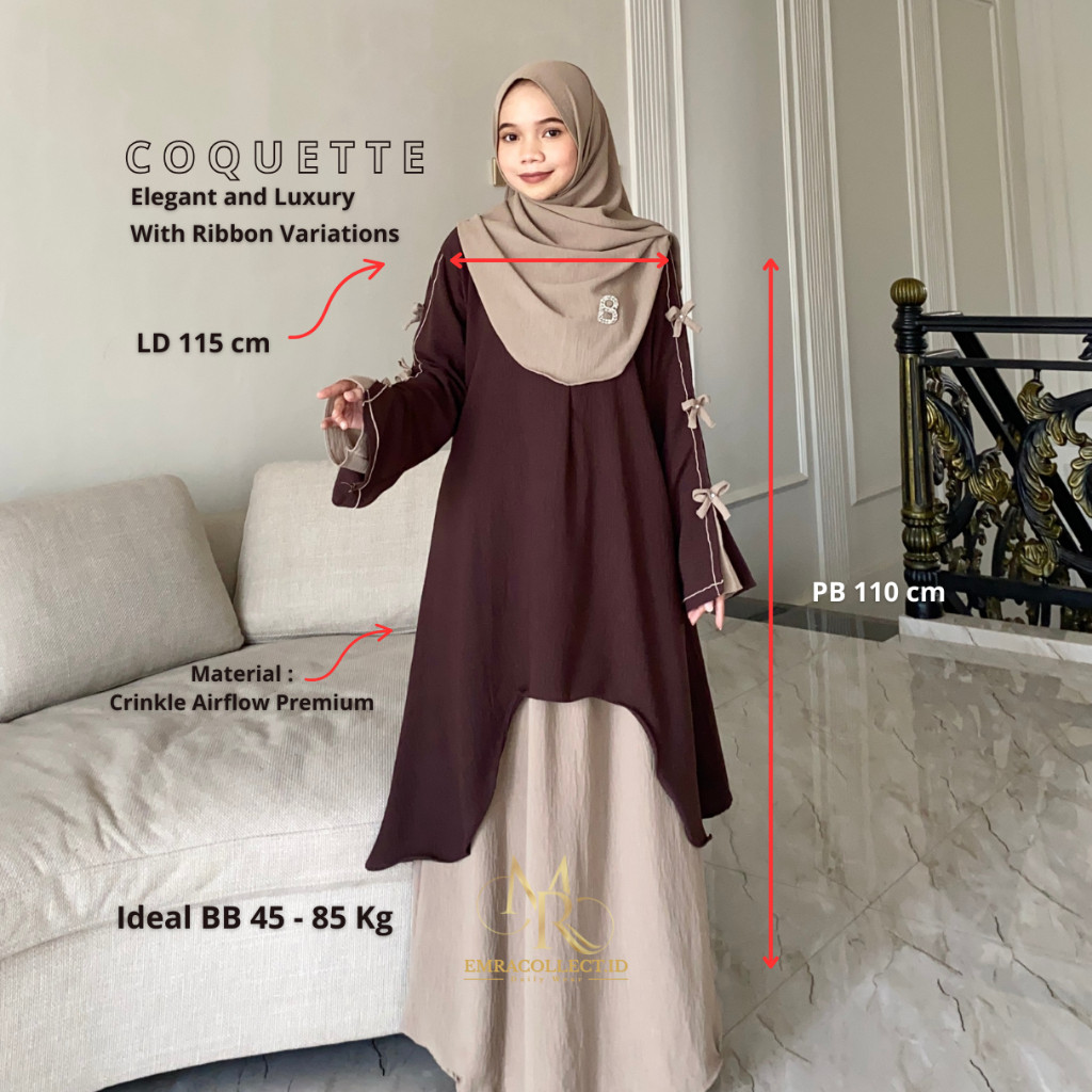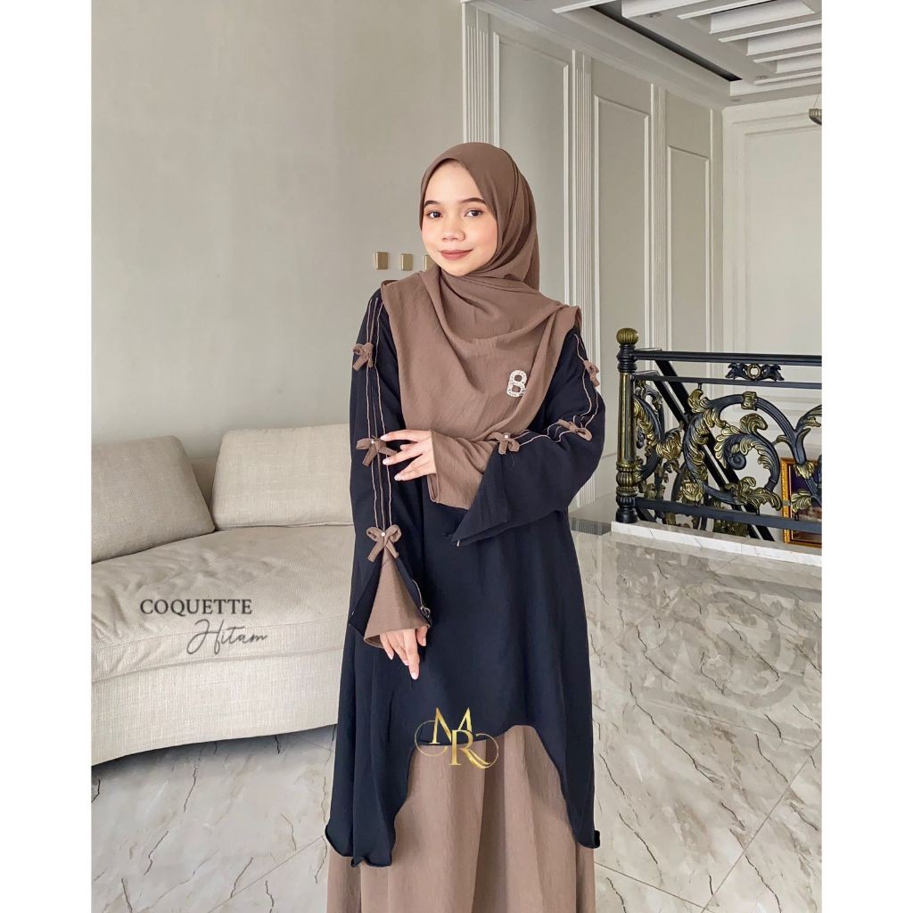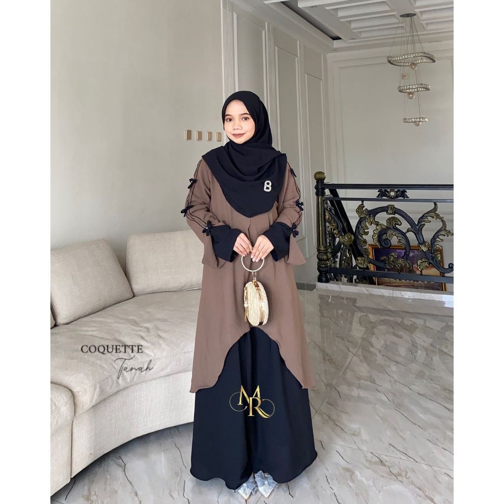 One Set Wanita Kekinian Rok Tunik Atasan Malaya Syari Crinkle COQUETTE Set Rok QINARA Malaya Kombinasi Pita