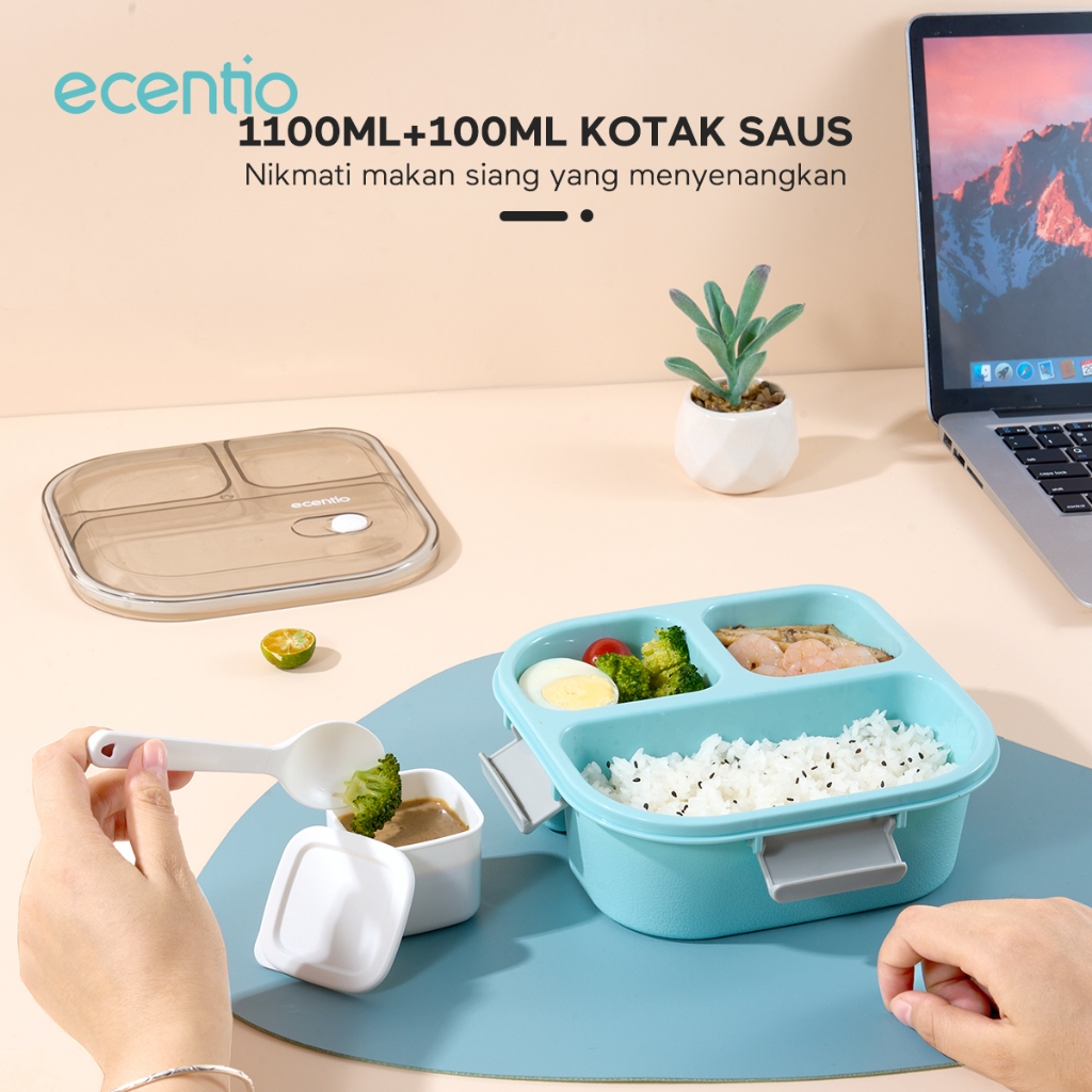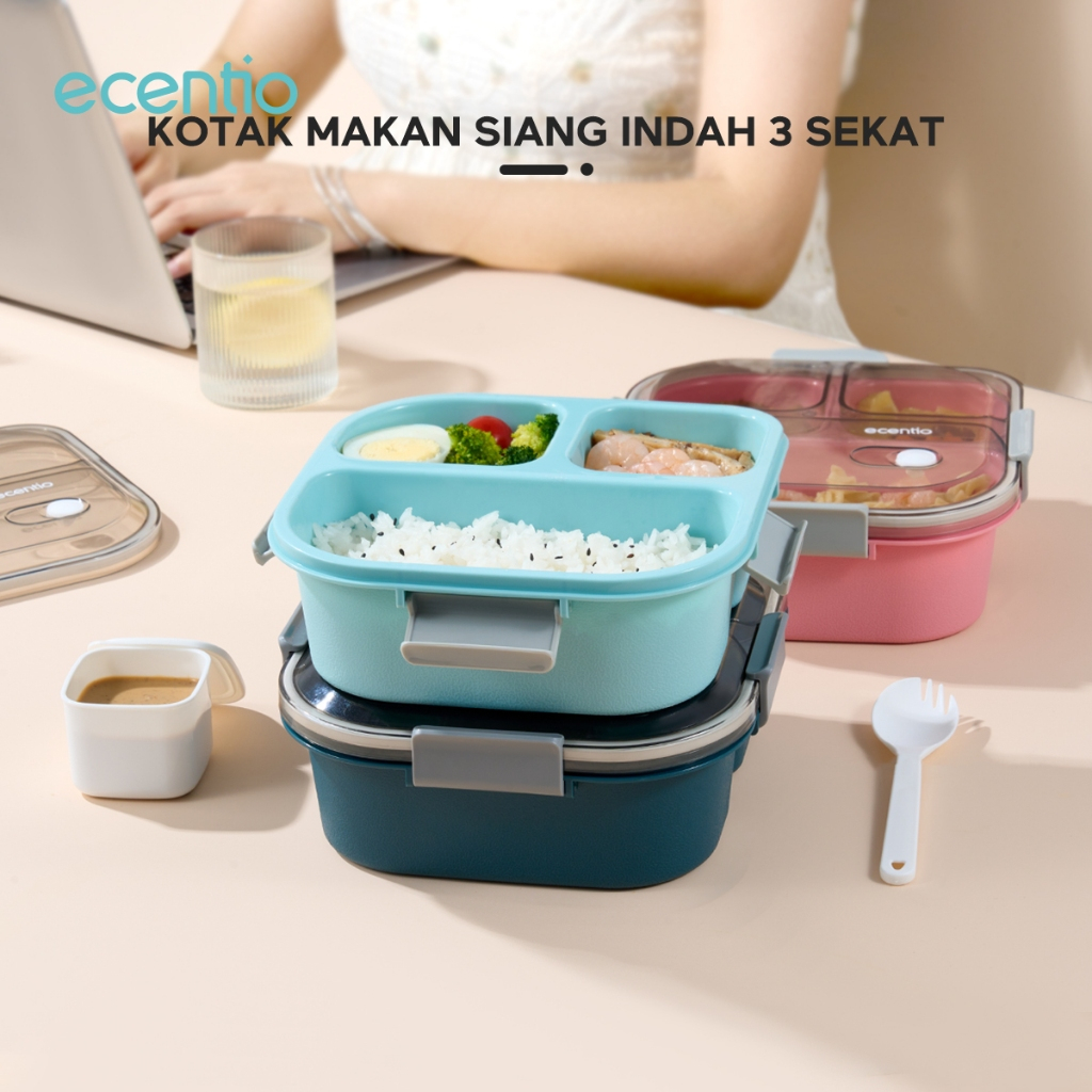 ecentio Kotak Makan 3 Grid lunch box/disegel Kotak/Anti bocor 1100ml+100ml/wadah individu/tempat makan dan sendok/ Free