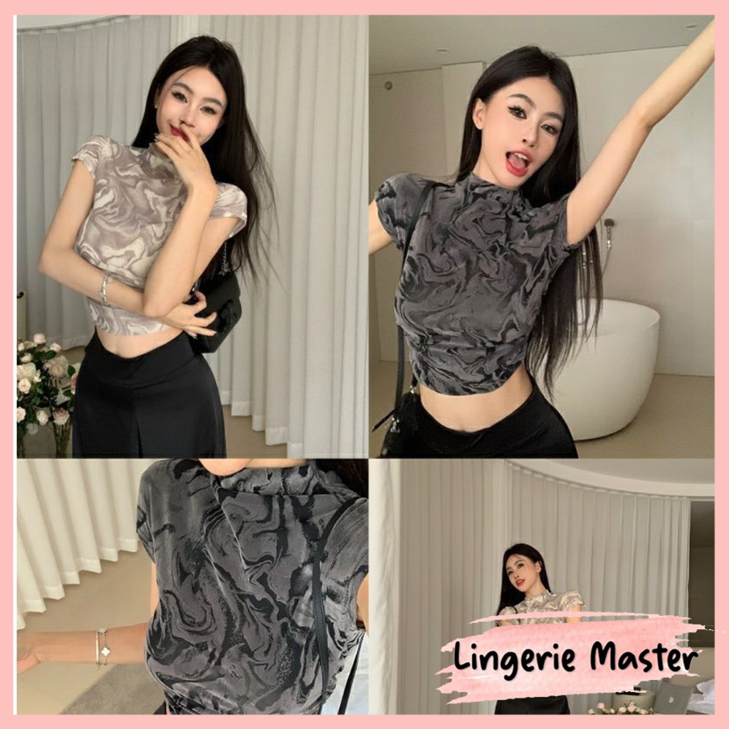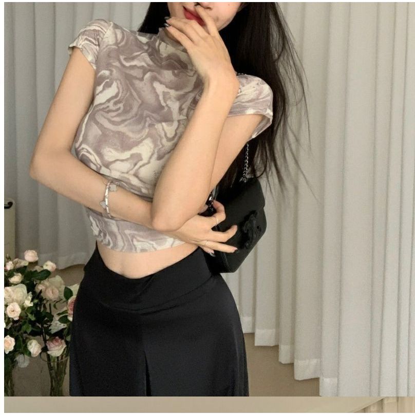 (T-148) Crop Top Marble Short Sleeve Pakaian Atasan Wanita Import Murah Gratis Ongkir