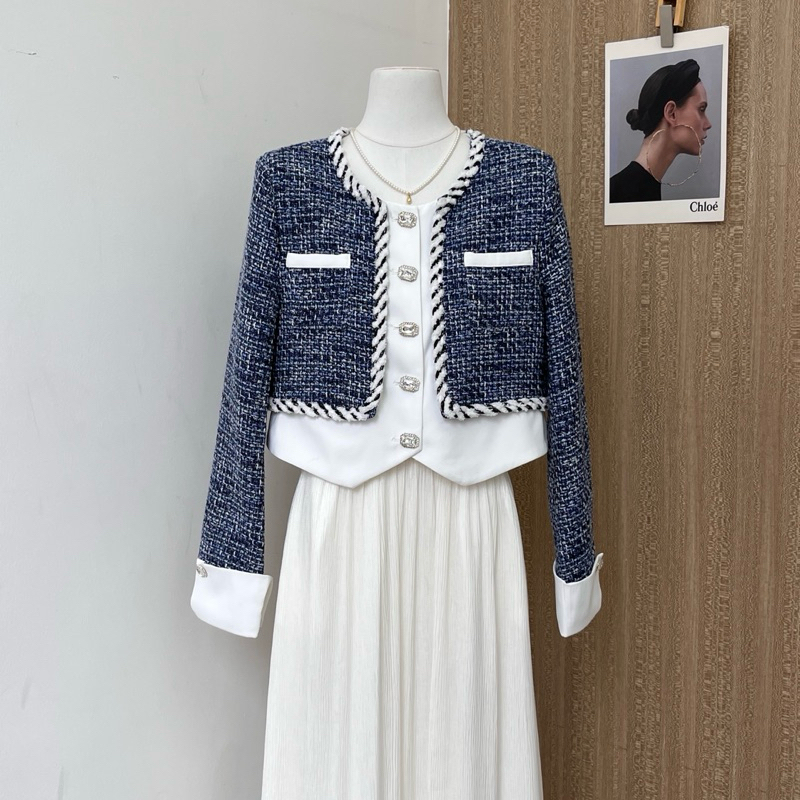 THE0NE || Fashionable Crop Blazer Tweed Fake Two Piece Tweed Buttons Premium High Quality S-2XL