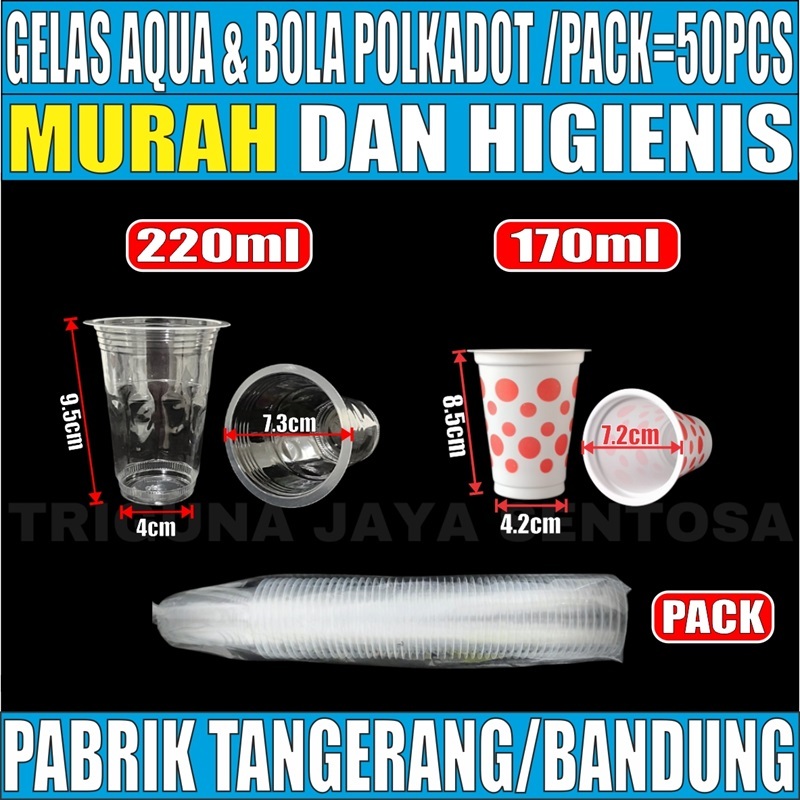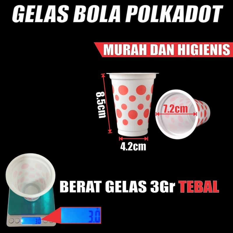 Gelas Bola Polkadot Tebal 3gr | Aqua uk 220ml /pack 50pcs u Kopi Teh Eskrim JSP Murah Gratis Ongkir
