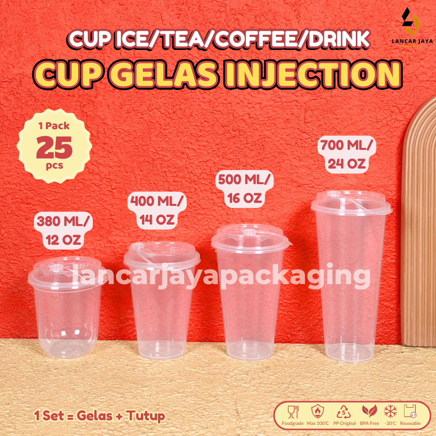 Gelas Plastik Injection Cup + Tutup PP Bening Frosted Transparan 14 Oz 16 Oz 22 Oz / 400 500 700 ML Murah Gratis Ongkir