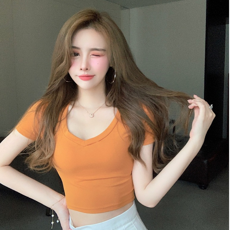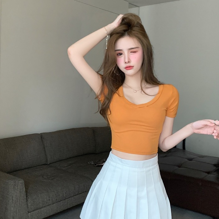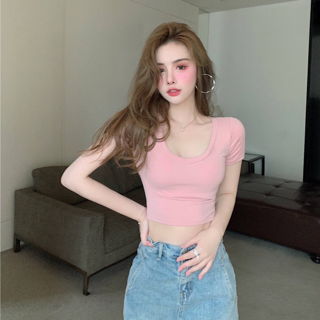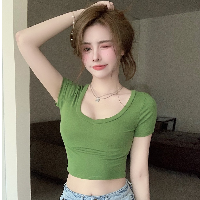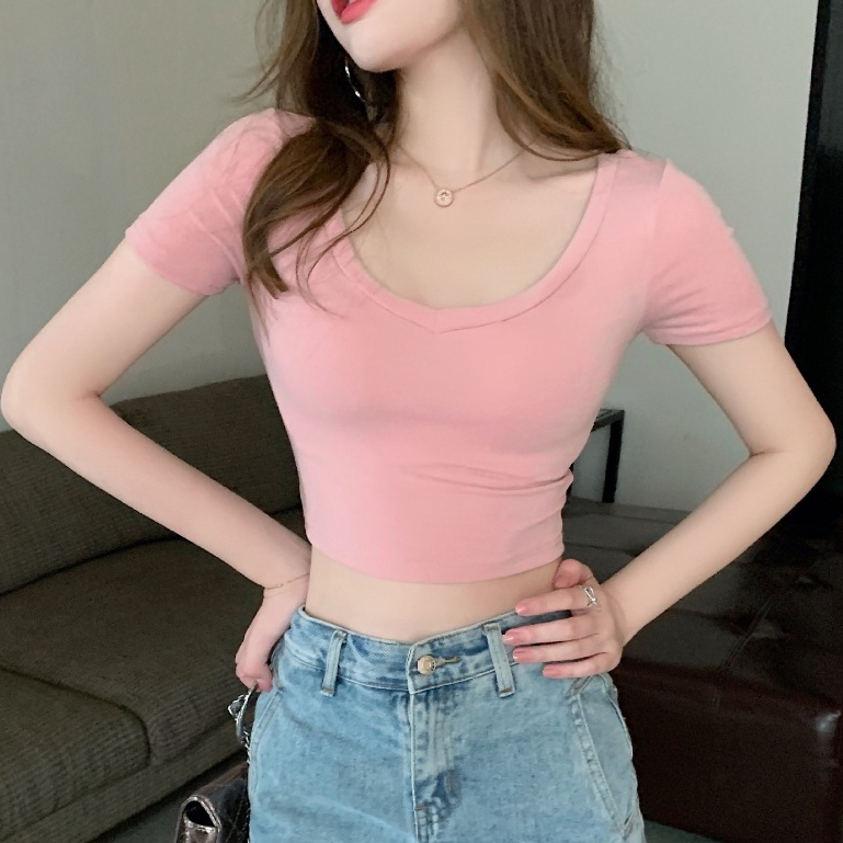 U Neck Slim Fit Crop Tee Top T-Shirt 1485 ( S-XL) Murah Gratis Ongkir