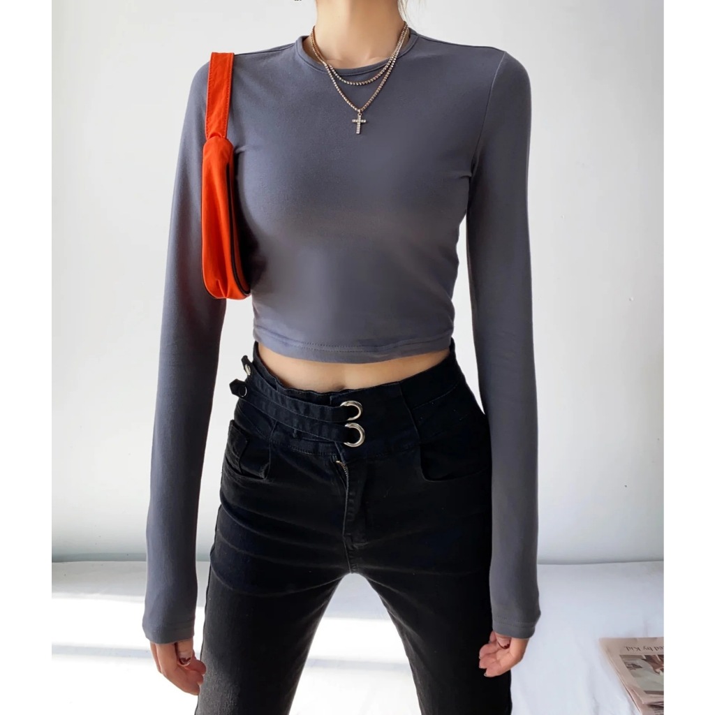 BJ1749 Baju Crop Top Atasan Knit Wanita Kaos Polos Lengan Panjang Long Sleeve Slim Fit Murah Gratis Ongkir