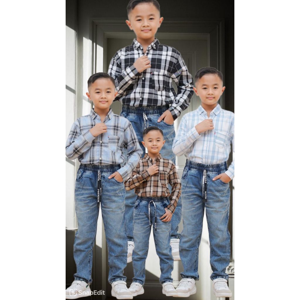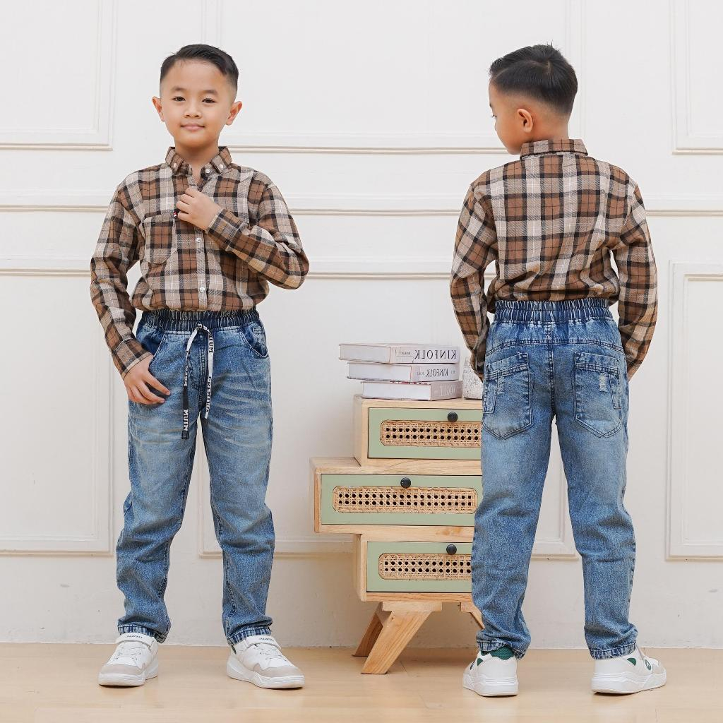 Setelan Anak Laki Laki Kemeja Katun Flanel Premium Dan Celana Jeans Bahan Melar Usia 7-12 Tahun