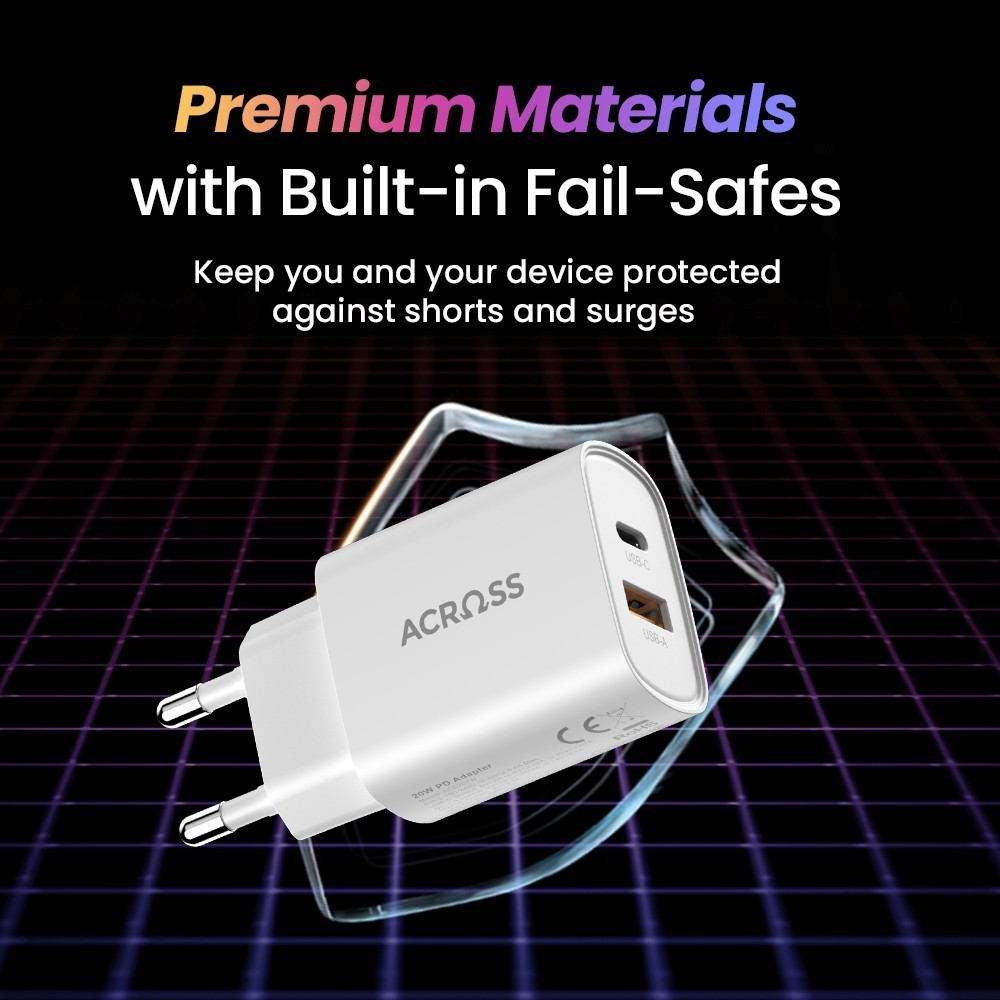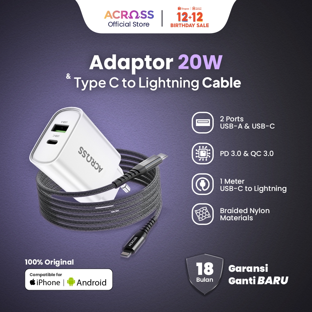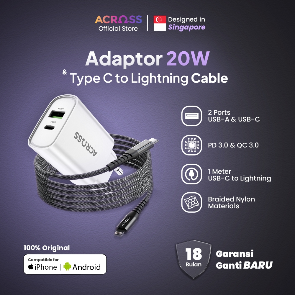ACROSS Bundle Kepala Charger 20W Adaptor Fast Charging White + Kabel Data Type C to Lightning 21W Charger IPhone MFi Bla