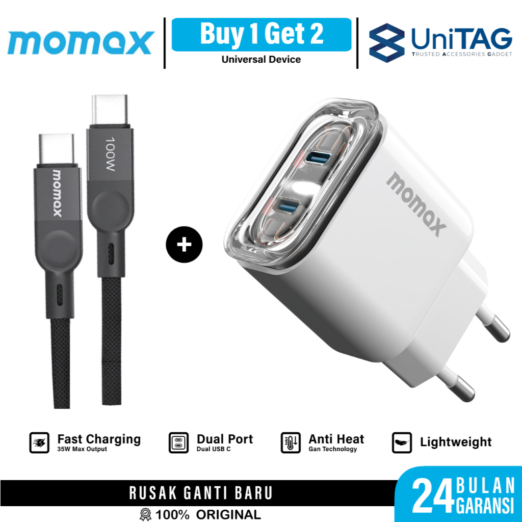 Momax Kepala Charger Adaptor USB Type C for iPhone Samsung 1-Charge Flow 35W PD GaN Dual Port