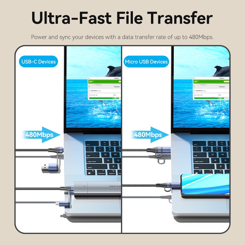 Vention Kabel Data Charger 4in1 USB A Type C to Type C Micro USB 5A Fast Charging Cotton Braided