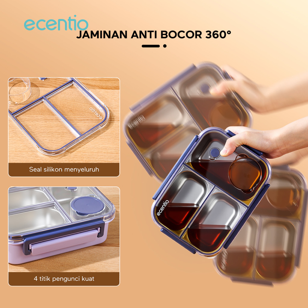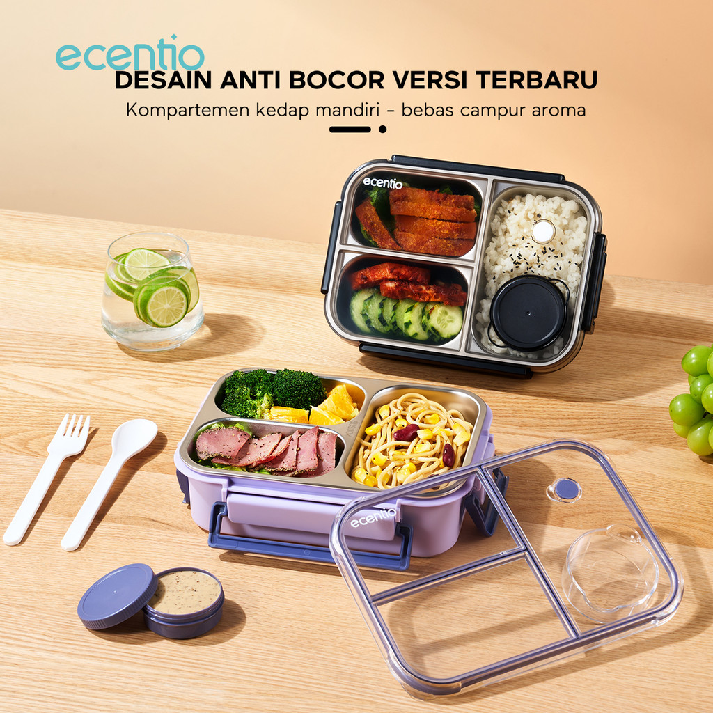 ecentio lunch box stainless/plastic 800ml sekat 3 dengan sendok free kotak sauce kecil Murah Gratis Ongkir