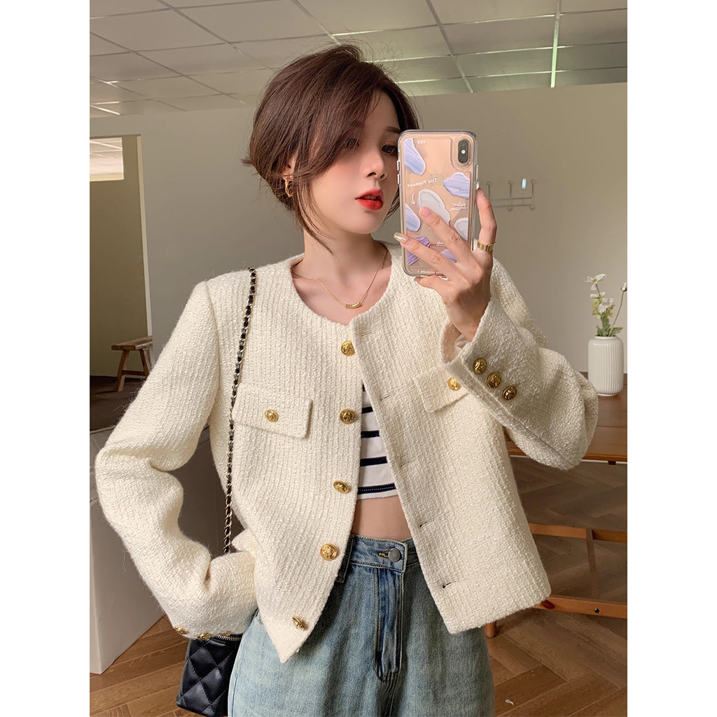 EMITA BLOOM french white tweed blazer batik wanita premium elegant office atasan er crop panjang lengan wanita kekinian korean style work crop formal jacket plus size