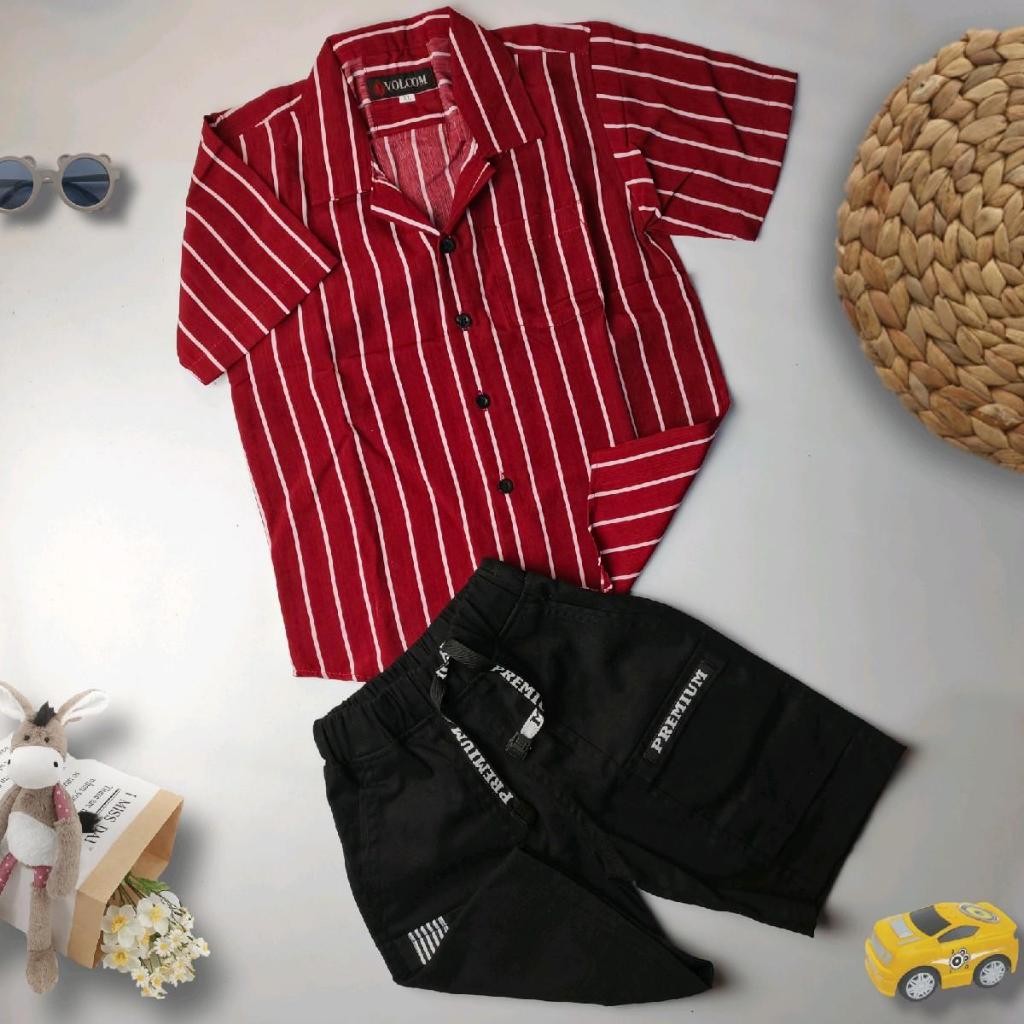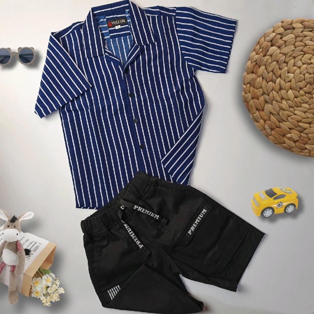 Setelan Anak Laki -Laki Usia 3-8Tahun Kemeja Anak Lengan Pendek Wollfis Garis-Garis & Celana Pen