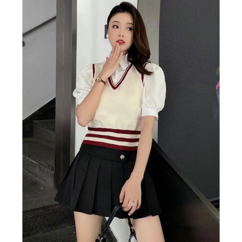 Blouse Atasan Areum Top Blouse Set Vest Shirt (Polo rompi) Collar Kemeja Kerah Knit Rajut Korean Style Lengan Pendek Shirt Academy Uniform Jepang