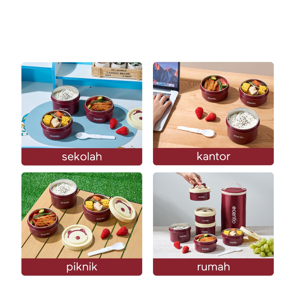 ecentio Lunch Box Kotak Makan 4PCS Set Stainless 304 Anti Tumpah (Merah) Murah Gratis Ongkir