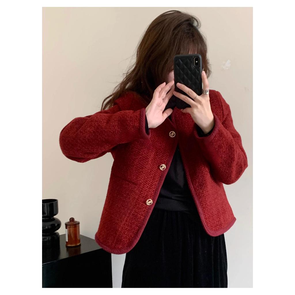 EMITA BLOOM baju christmas er burgundy wanita kekinian korean style tweed blazer plus size cute croptop formal er merah kondangan simple elegan