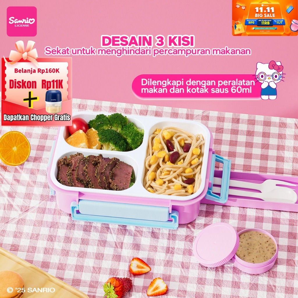ecentio 800ml 3 Gird Kotak makan Set anti tumpah lunch box anak lucu kotak bekal anak perempuan free sendok BPA FREE tem